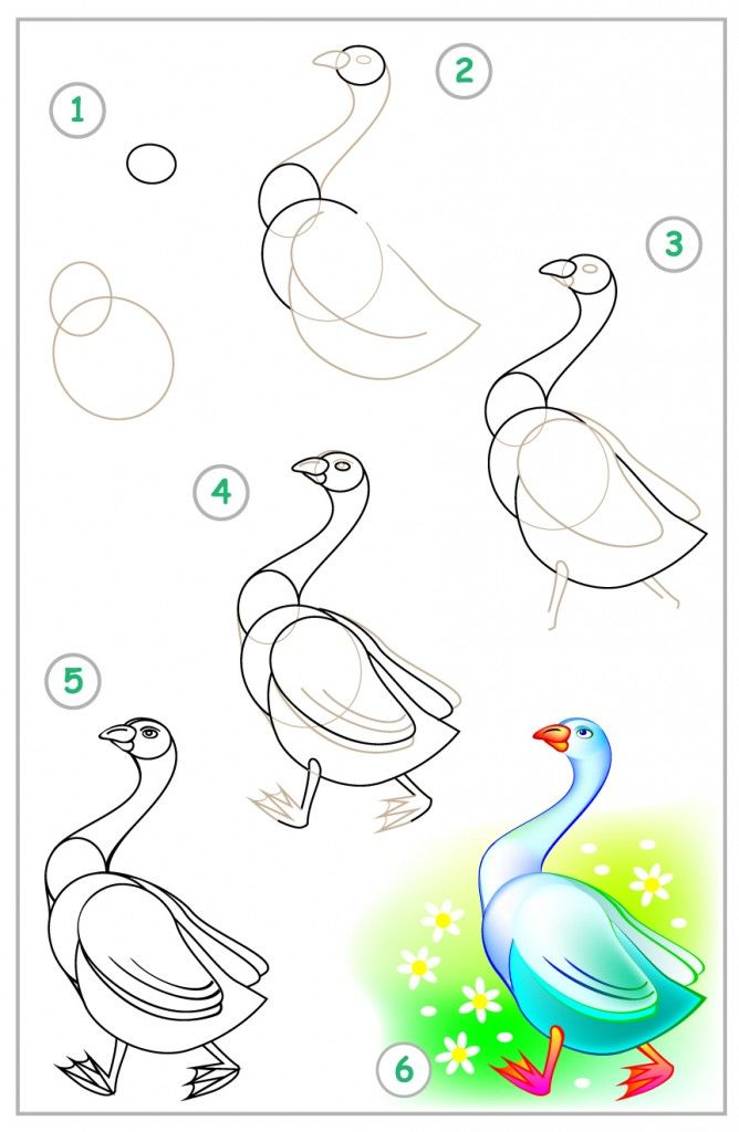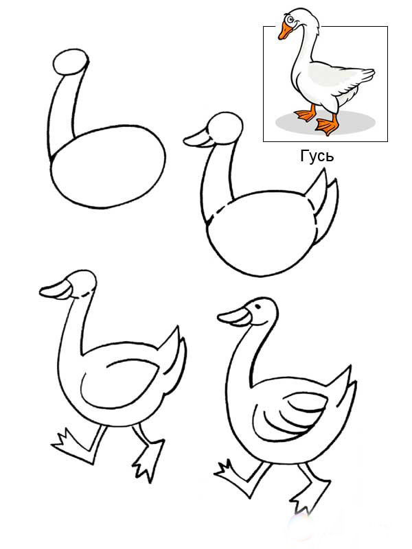 Гъската и гъските могат да бъдат нарисувани стъпка по стъпка по следния начин: