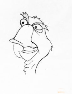 - След това постепенно добавете подробностите. Нарисувайте цилиндъра, а след това поемете лицето на Макдък: нарисувайте ясно повдигнати вежди, големи очи, очила и огромен клюн, не забравяйте за бакенбардите, на този етап можете да нарисувате и ръцете. Този анимационен герой винаги е с ръкавици на ръцете и с камизолка на торса. Ние dorisovyvayu стик, сенки фрагменти скица с черна боя, която се разрежда с вода, излишната влага абсорбира с памучни кърпички. Очната ябълка и очилата са нарисувани с разреден син акварел.