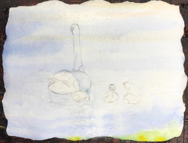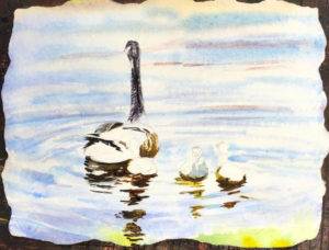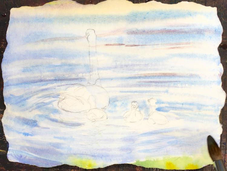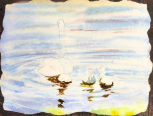 Повърхността на езерото е маркирана със слаби, понякога прекъснати линии. Ако желаете, можете да нарисувате езерото със синьо-сини водни бои или цветни моливи. Гъските могат да бъдат боядисани в различни нюанси на бялото или черното.
