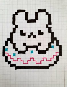 - Точно над средата на листа, на разстояние 7 клетки, нарисувайте две вертикални дъги, заемащи 2 клетки, и завършете с уши, които имат овална или кръгла форма, отгоре. Във всяка ушна мида има капчица, обърната с острата си страна към основата на ушната мида. Тези капчици са ушните миди.