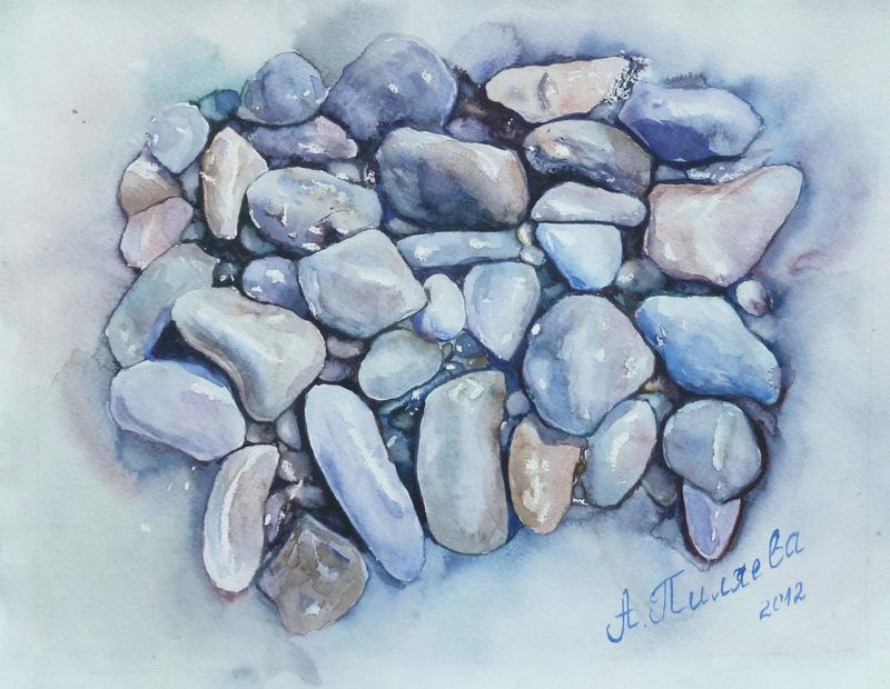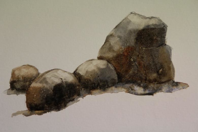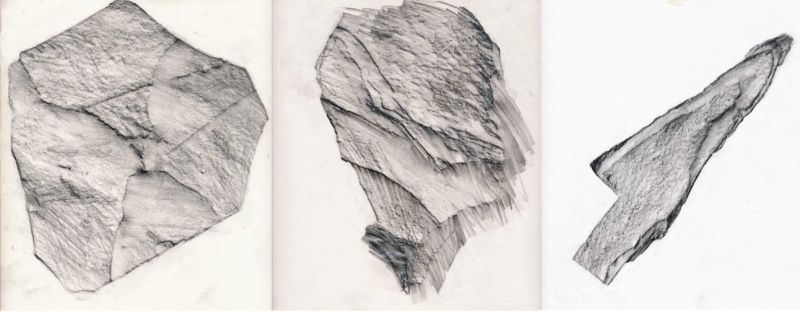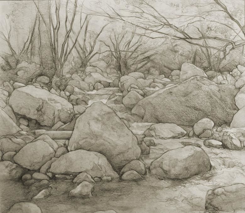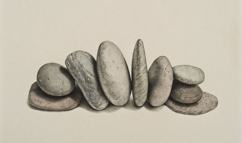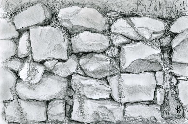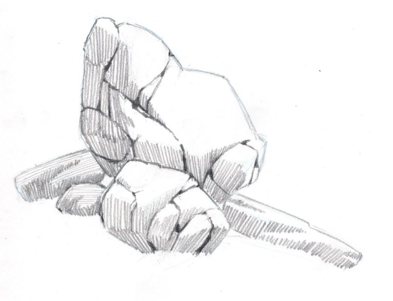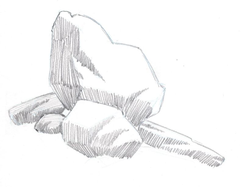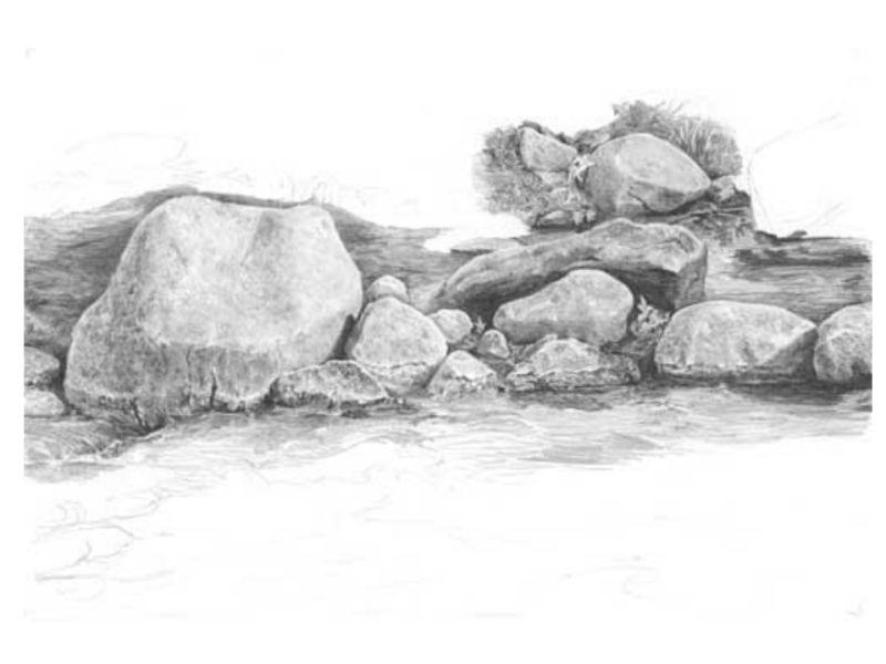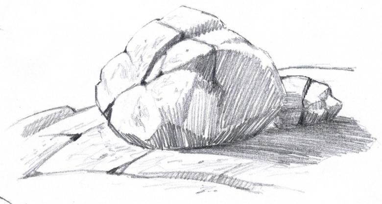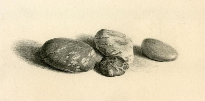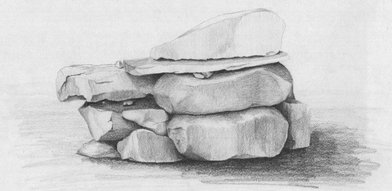 Когато рисувате група камъни с различен размер, трябва да обърнете внимание не само на собствените им сенки, но и на сенките, които хвърлят един върху друг. Структурата на повърхността първо се очертава с твърд молив, а след това се прецизира с малки щрихи, направени с най-мекото олово.