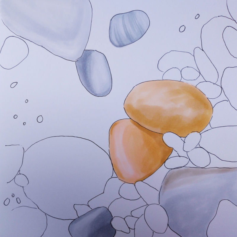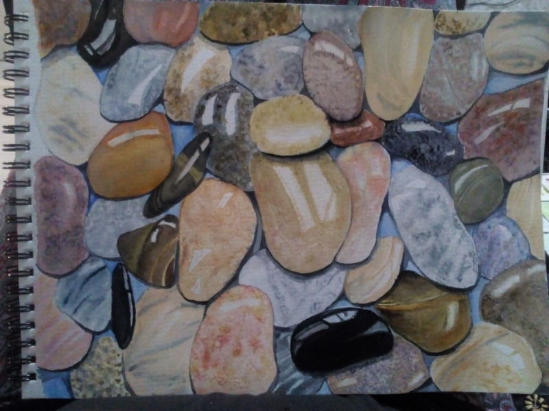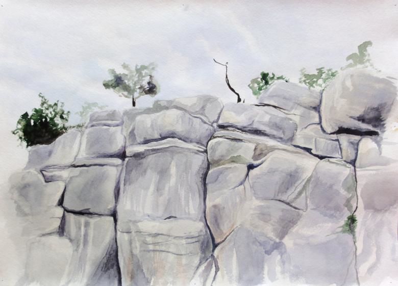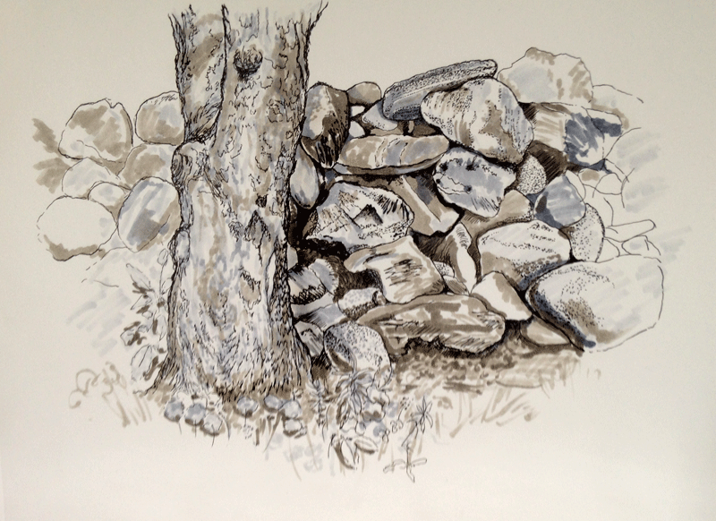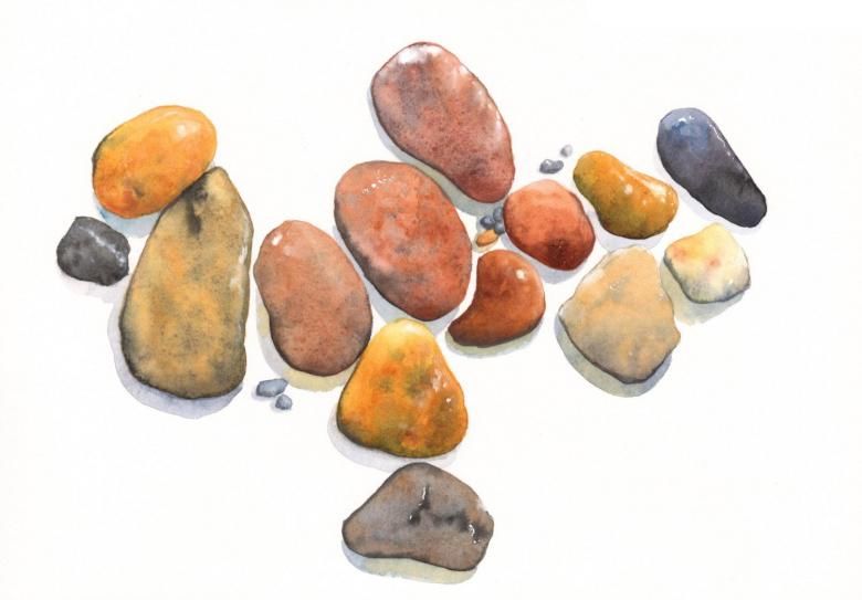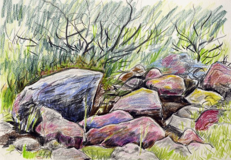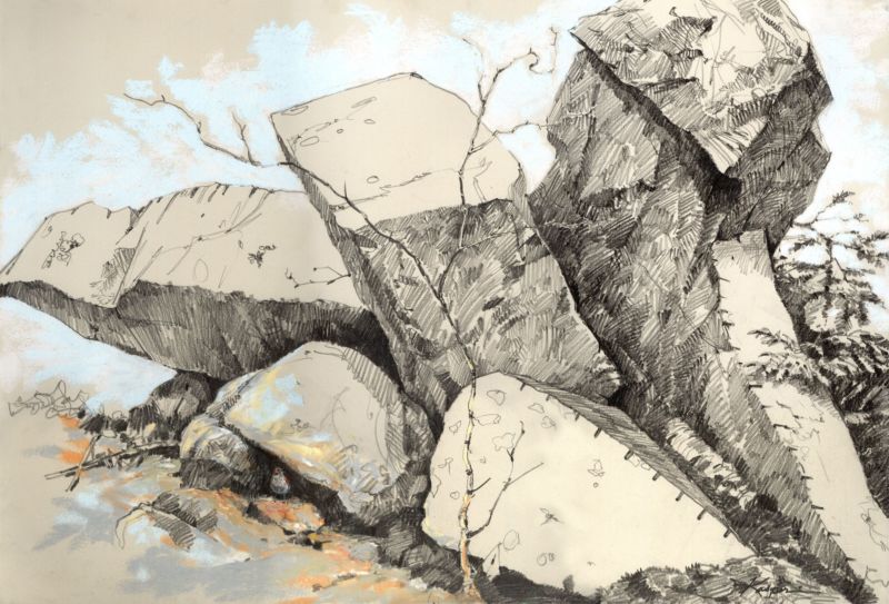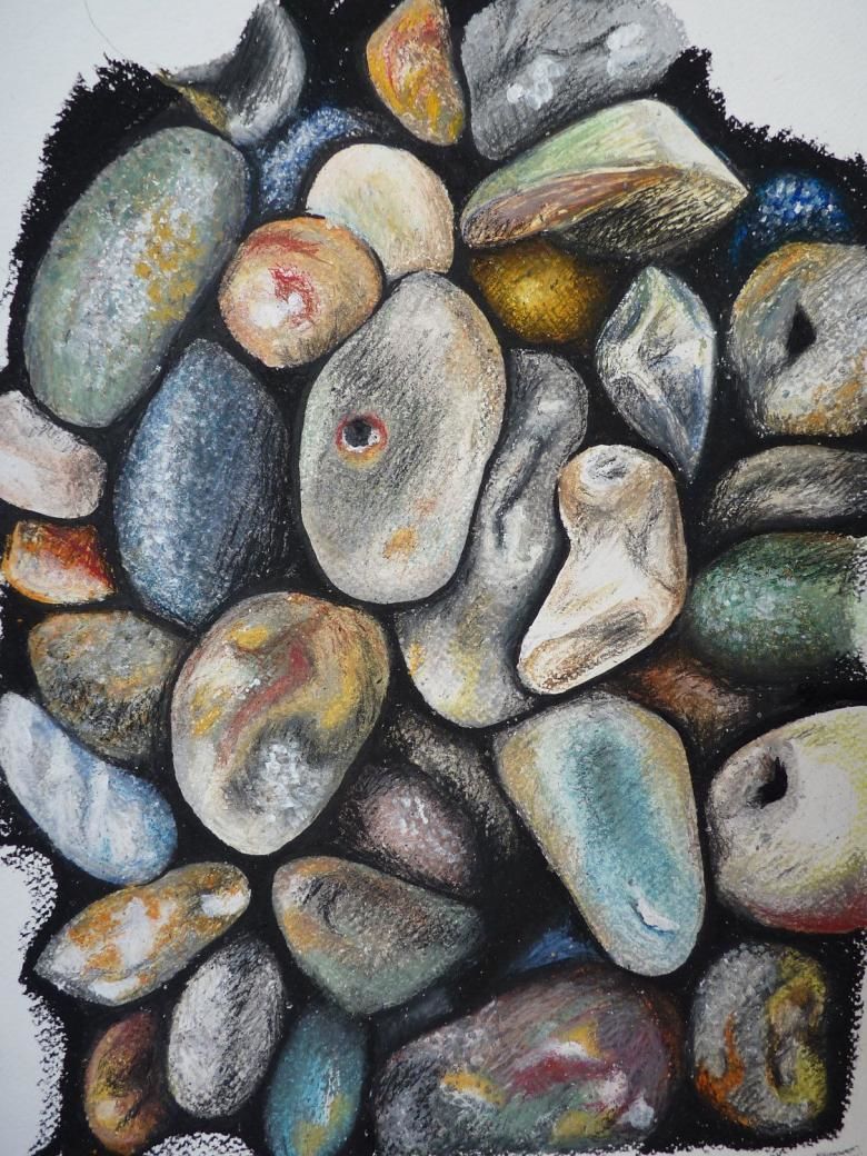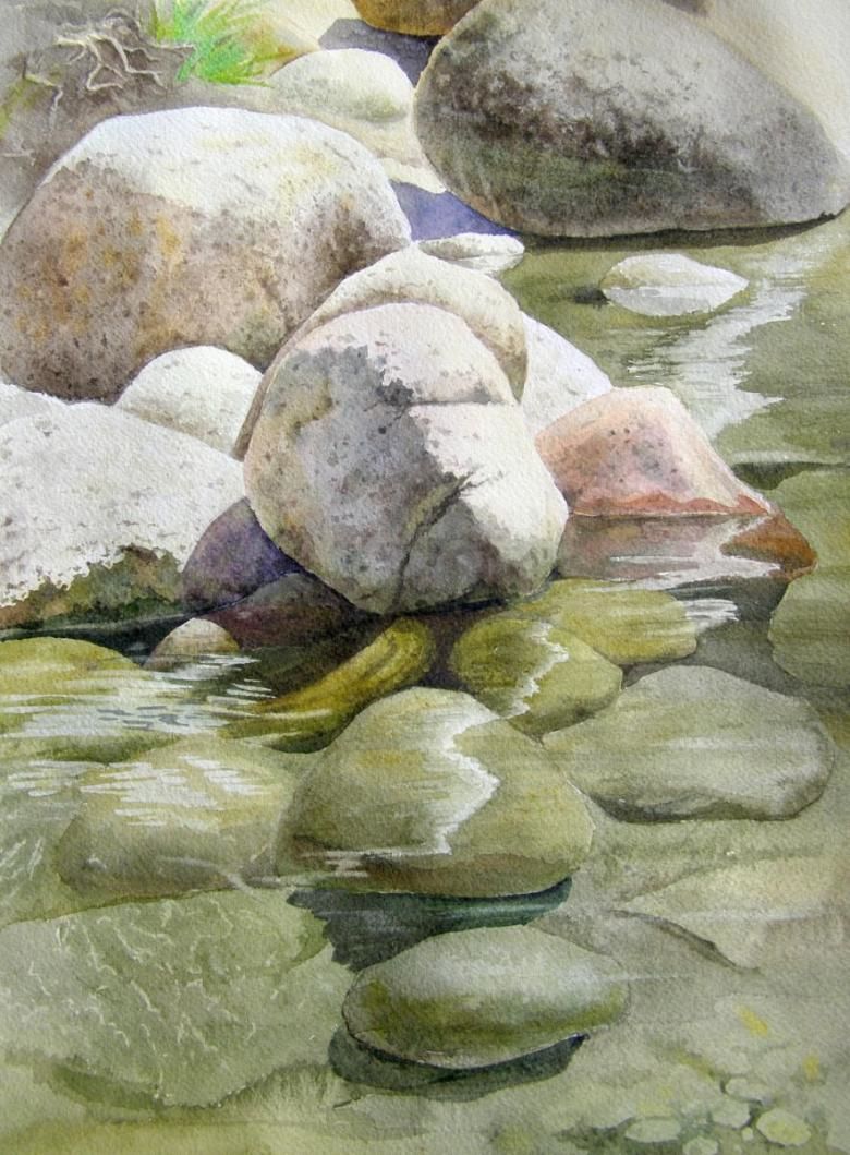 Когато рисувате група камъни с различен размер, трябва да обърнете внимание не само на собствените им сенки, но и на сенките, които хвърлят един върху друг. Структурата на повърхността първо се очертава с твърд молив, а след това се прецизира с малки щрихи, направени с най-мекото олово.