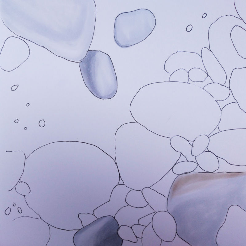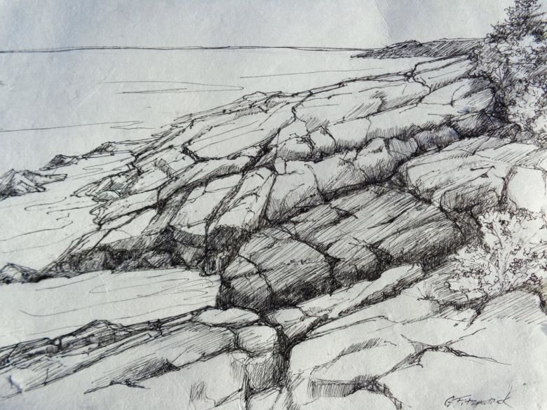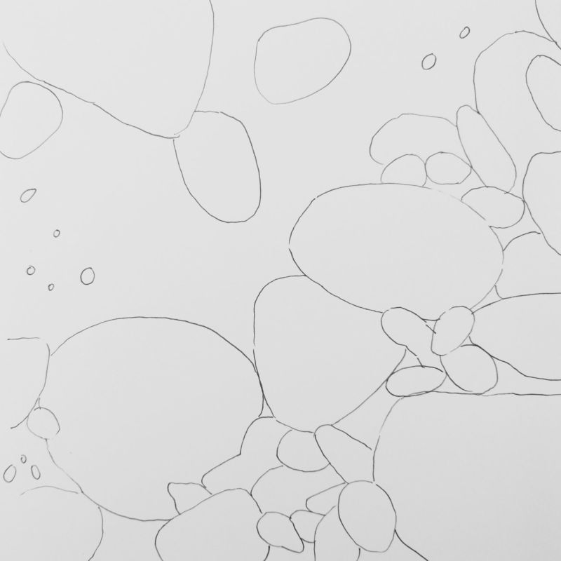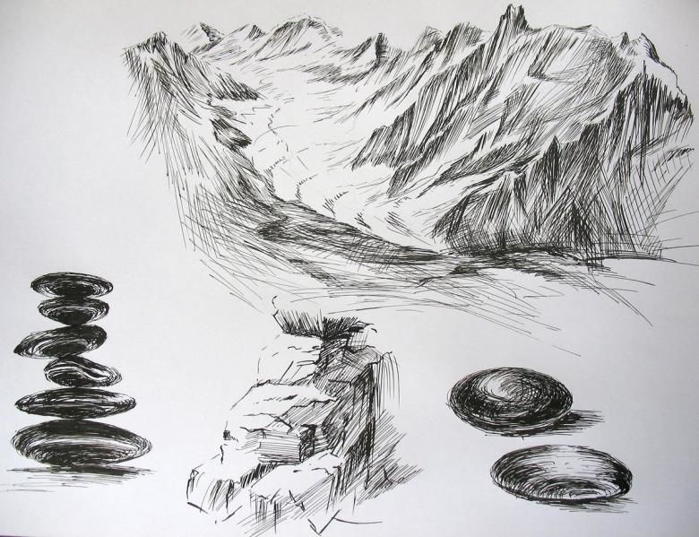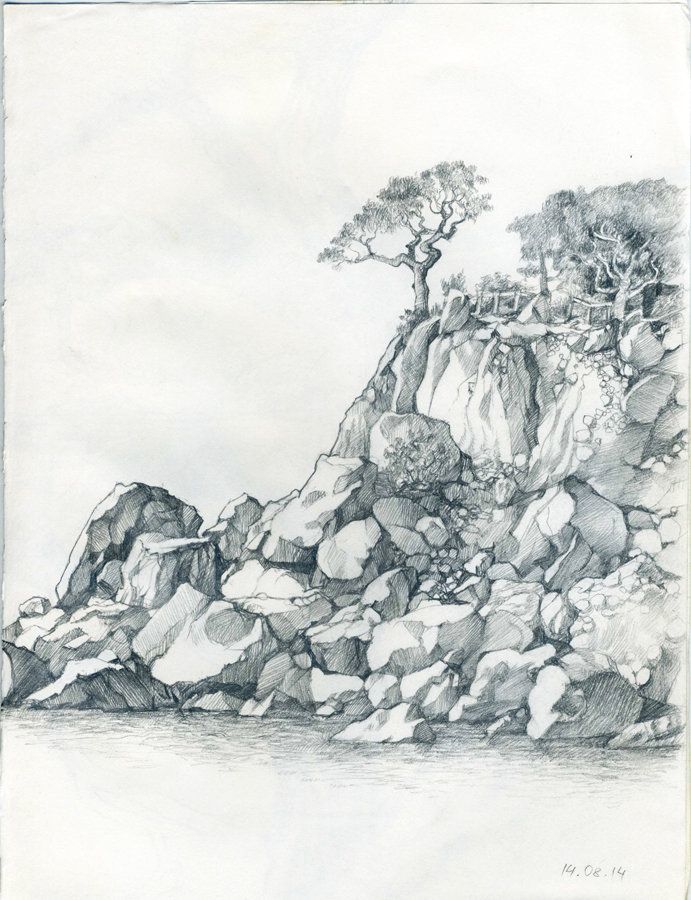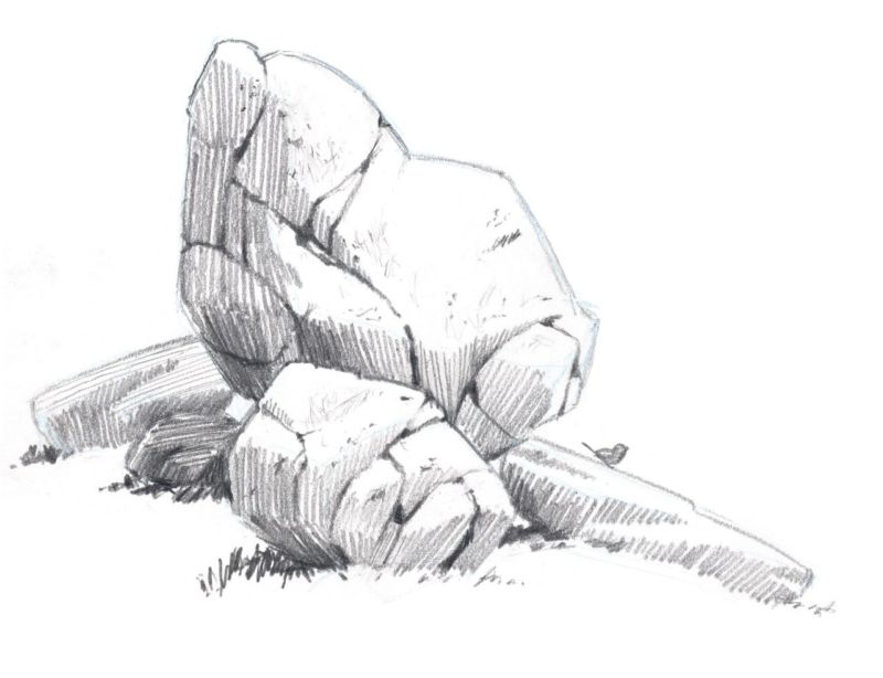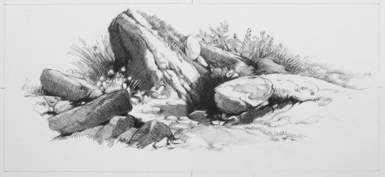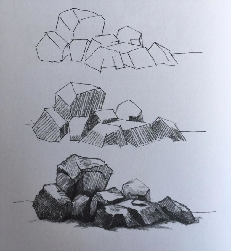 С помощта на обикновени моливи с различна степен на мекота можете да започнете да скицирате композицията върху лист хартия. След като сте нарисували с твърд молив общия обем на един или повече камъни, съсредоточете се върху скицирането на вдлъбнатини, пукнатини, вдлъбнатини и сенки.