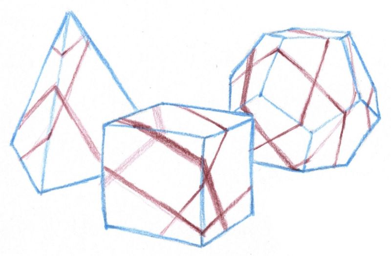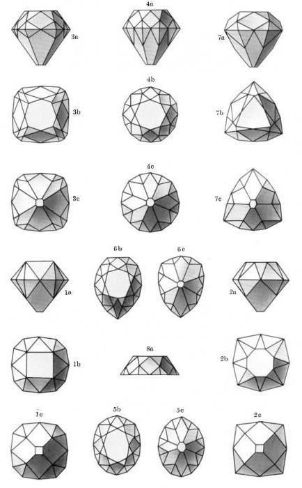 От тези точки линиите се разминават под тъпи ъгли, за да се пресекат и да образуват лица. Всички точки, получени в горната част, са свързани с непрекъснат сегмент, така че повърхността на камъка става плоска и играта на светлината се създава от многобройните странични сенки и отражения.