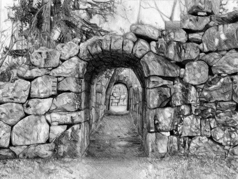 Всеки елемент от зидария или калдъръмена настилка е изграден като триизмерен обект, върху него са идентифицирани най-светлите и най-тъмните зони, а след като разпредели собствената си сянка върху всяко камъче, можете да започнете да ги рисувате с малки точки и чертички на грапавата повърхност.