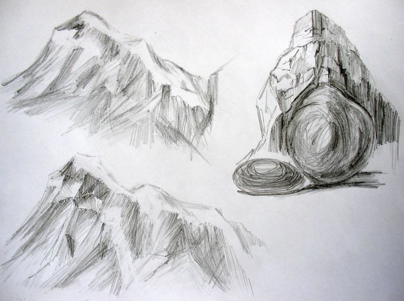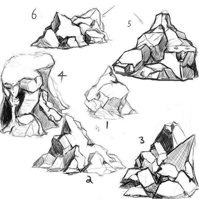 Най-добрият вариант за учене на рисуване на скали е екскурзия, при която децата могат да правят скици от природата. Изберете голям камък с интересна форма, за да му направите няколко скици, които постепенно да оформят обемната му форма.