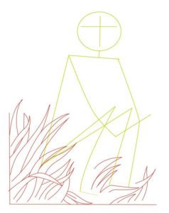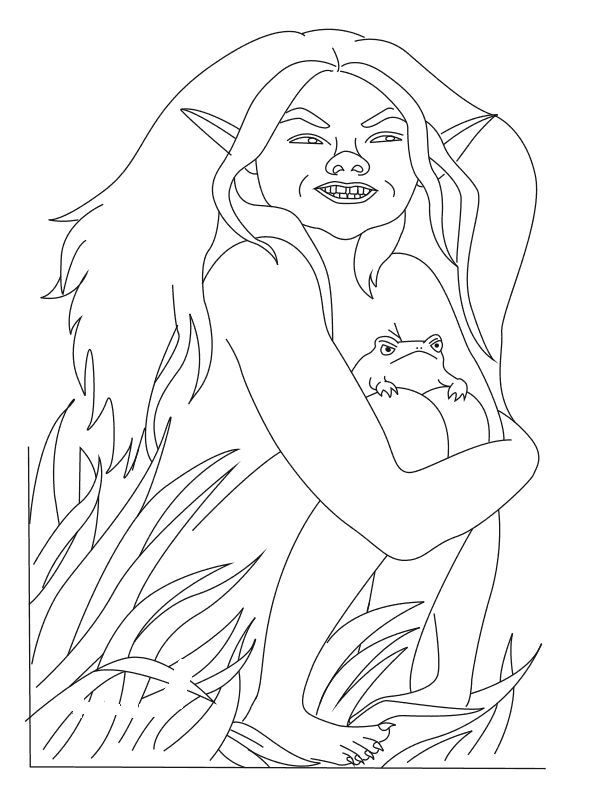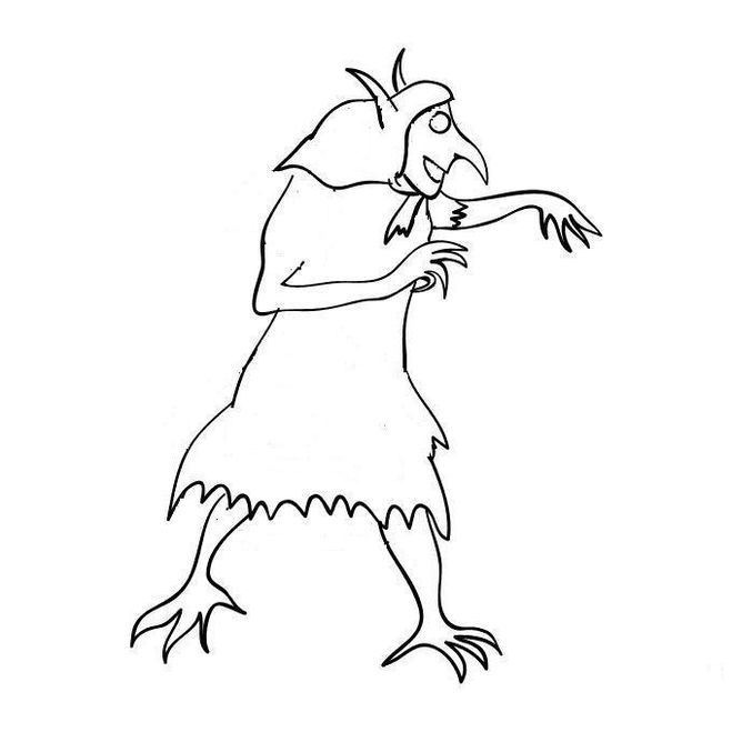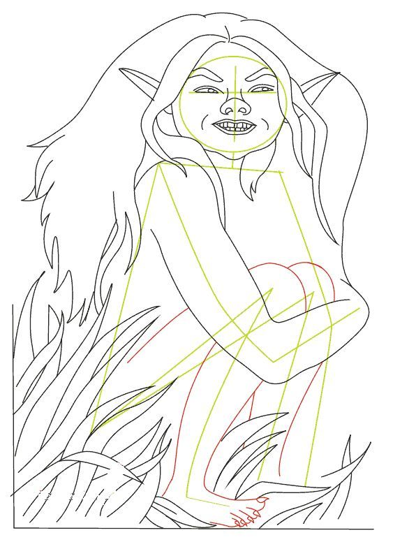 След това се очертават контурите на торса: двете рамене, краката. Контурът се очертава така, че основните линии на схемата да са в центъра. Остава да се нарисуват лицето, косата на кикимора и жабата зад синуса.