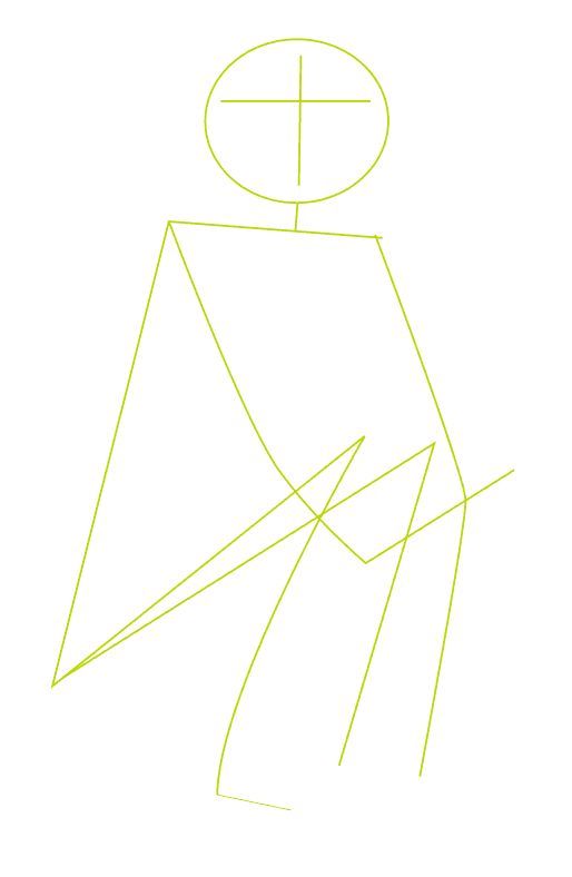 - Следва проследяване на контура на тялото. Прилича на камбана и има триъгълна форма. Върхът на триъгълника играе ролята на врата, а основата му - на подгъва на пелерината. Силуетът е леко изнесен встрани от главата. Главата се издърпва напред. Краят на кърпата покрива леко прегърбения гръб.