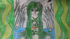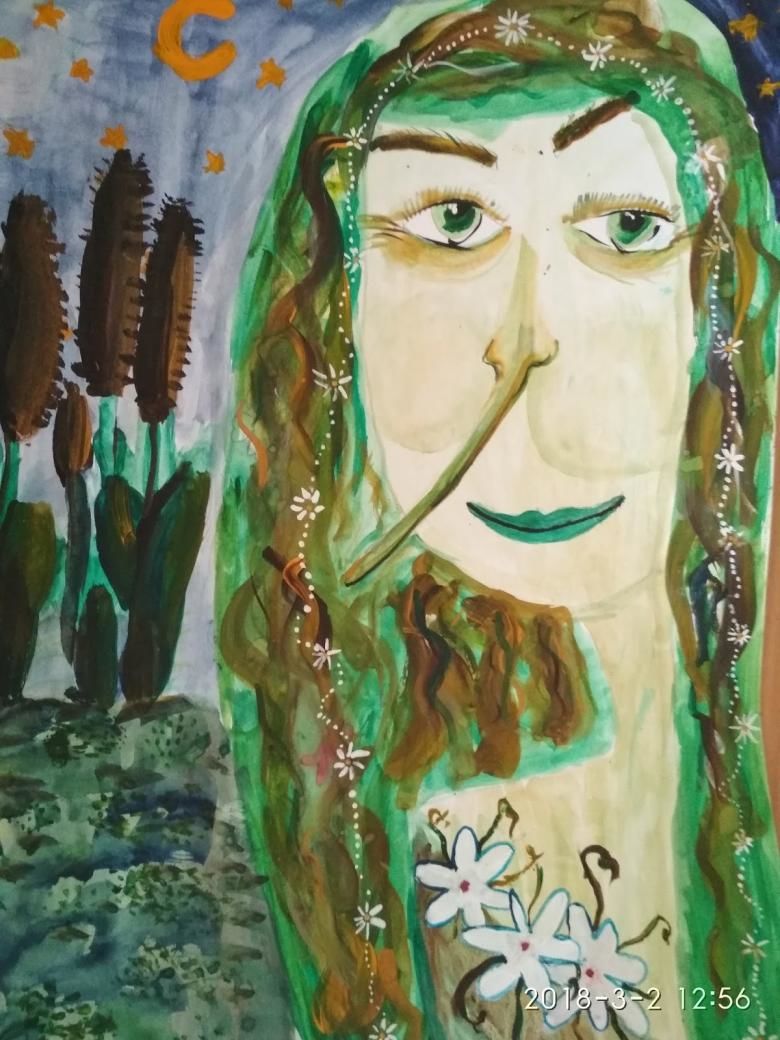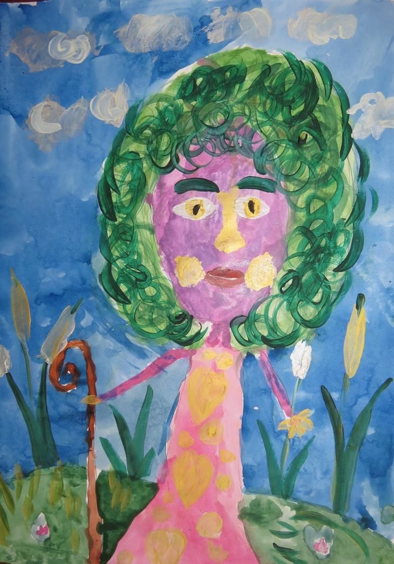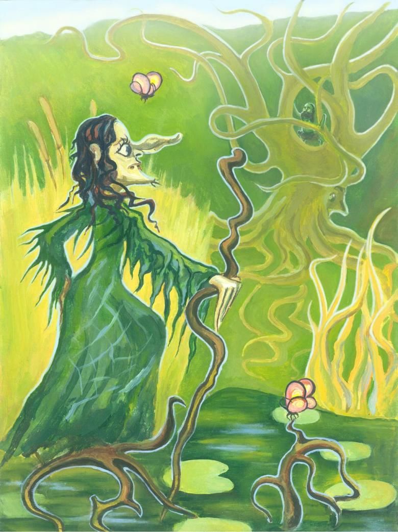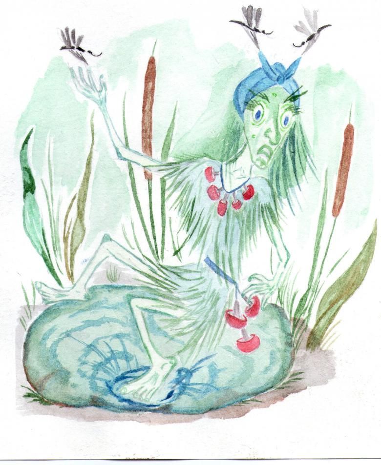 Остава да се нарисува бастунът, на който се подпира Кикимора, а другата ръка държи мушама или тръстика, блатни лилии, лилии.