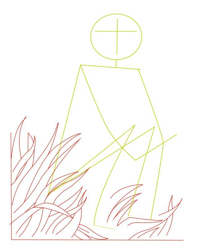 - Някъде по средата линията на ръката сменя вектора си и се насочва към точката, в която по-късата трапецовидна линия се прекъсва, показвайки къде ще бъде лакътната става.