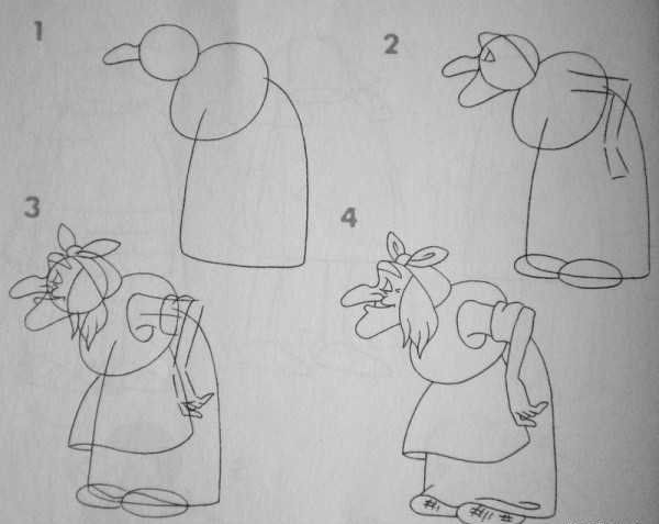 - Сега, за да изобразите правилно движението, трябва да нарисувате лицето на кикимора - овал на две трети от главата. Линия, която ще предаде положението на кърпата, покриваща челото на старата жена. Под тази линия нарисувайте вежди, очи, нос, устни.