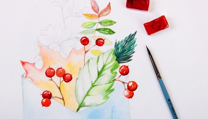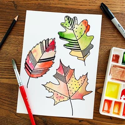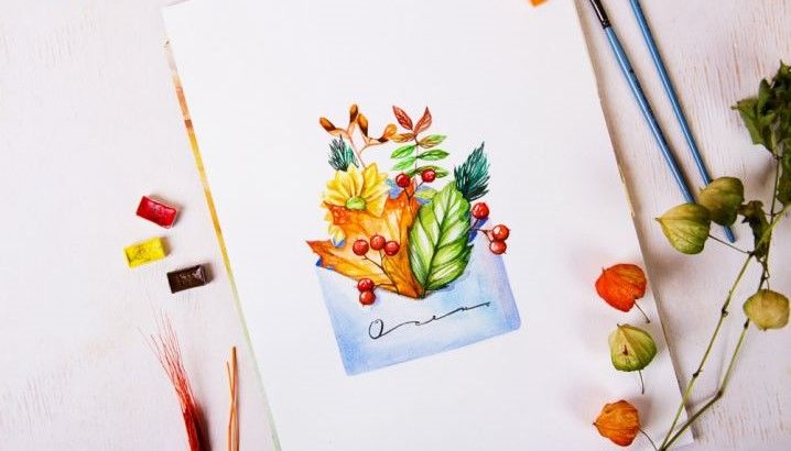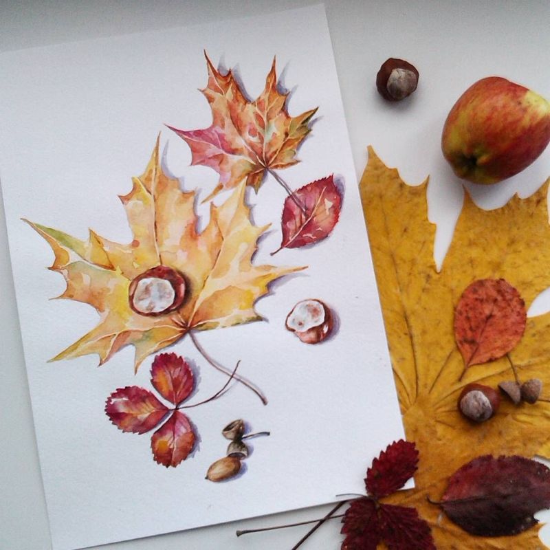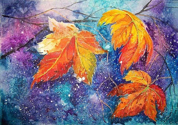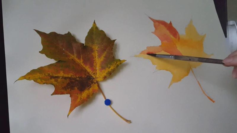Есенните листа са изобразени на жълт фон, който може да бъде оцветен в зелени, червени или кафеникави тонове. Природата сама ще ви подскаже как да изберете правилната есенна палитра и да направите скицата най-реалистична.