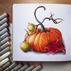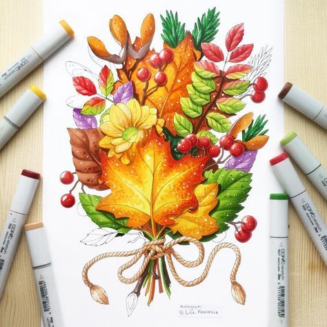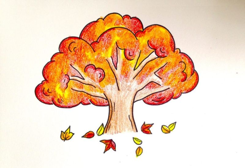 След като отстраните излишните линии с молив с гума, можете да оцветите листата в жълто, зелено и ярко оранжево.