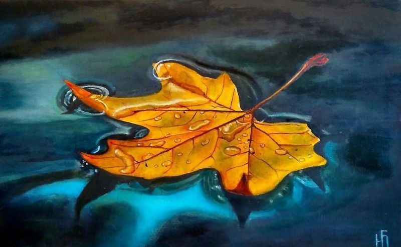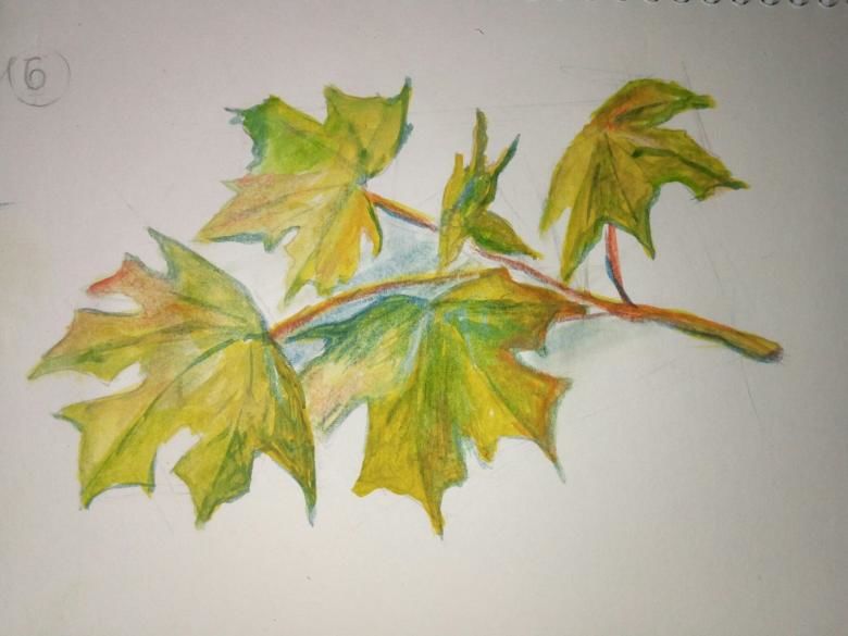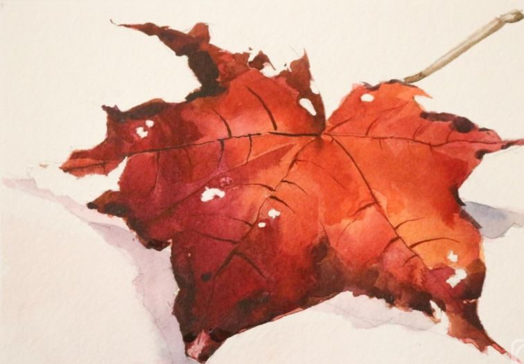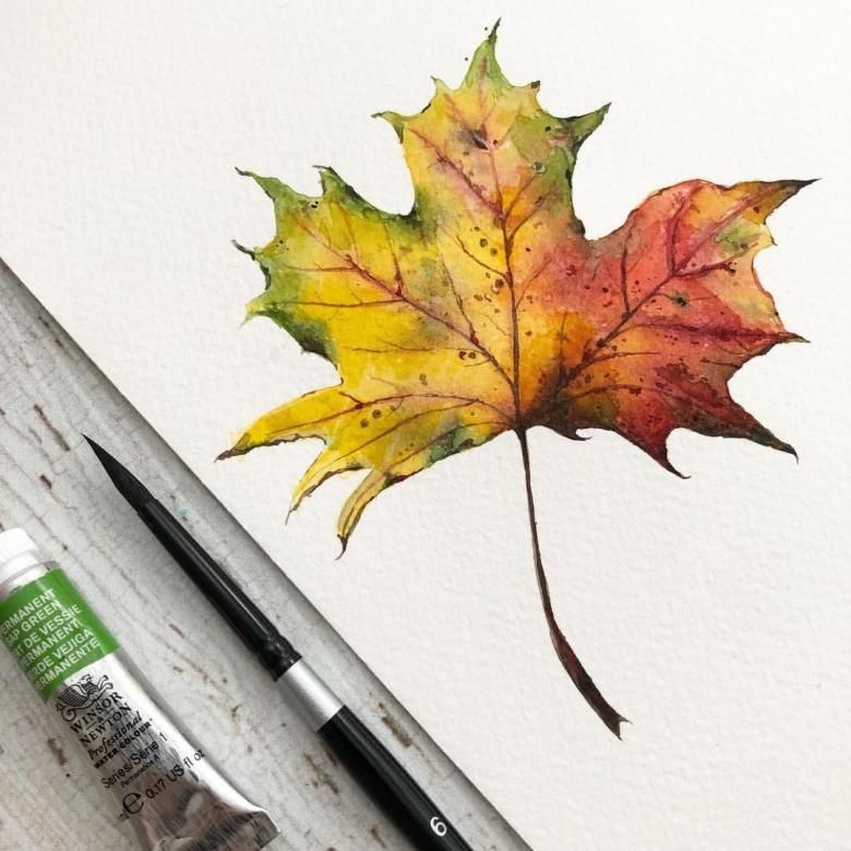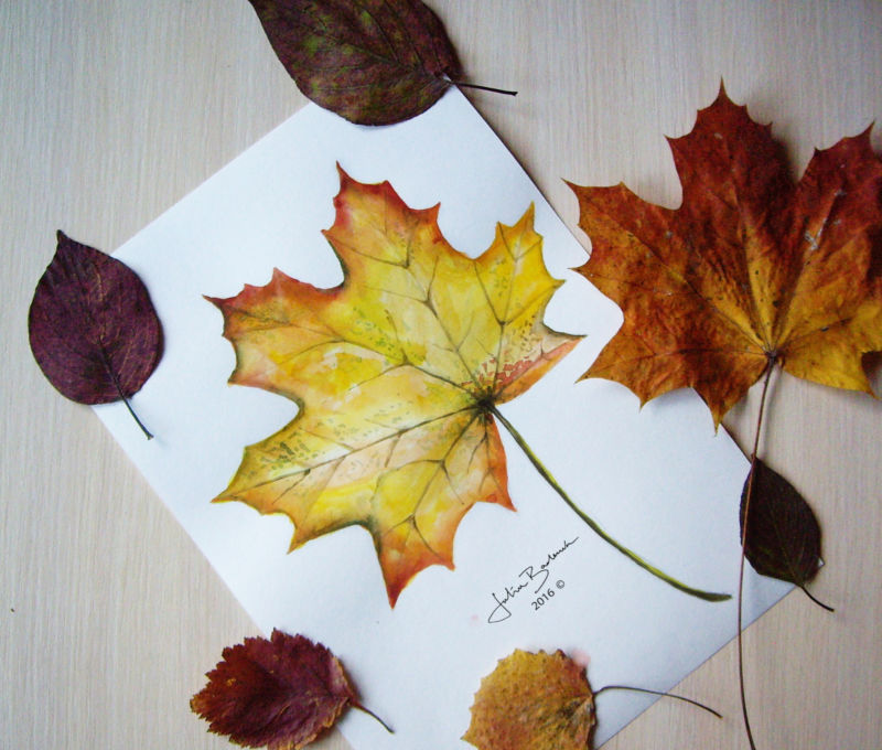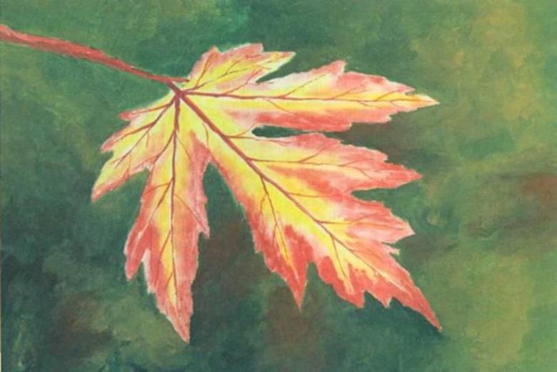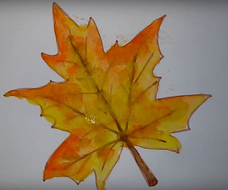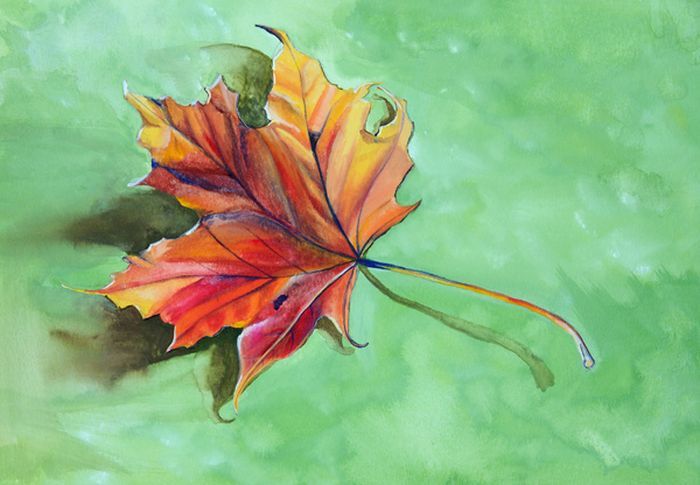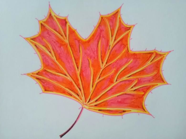 След като кленовият лист е нарисуван с молив, излишните линии се отстраняват с гума и можете да започнете да оцветявате с всяка техника, предпочитана от автора.