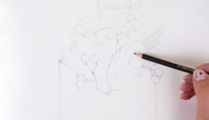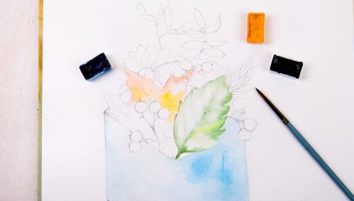 След това използвайте гума, за да премахнете следите от кръгове и други излишни линии. Когато контурът на букета е почти завършен, оцветете рисунката. Най-малкото листо на преден план трябва да е най-яркото и контрастно.