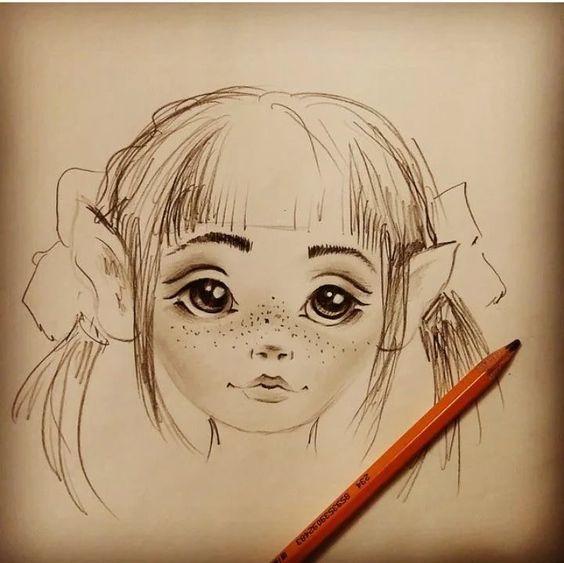 - Последната стъпка е да нарисувате лицето: първо очите, след това веждите, носът може да се нарисува като 2 точки и накрая малка уста.