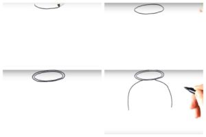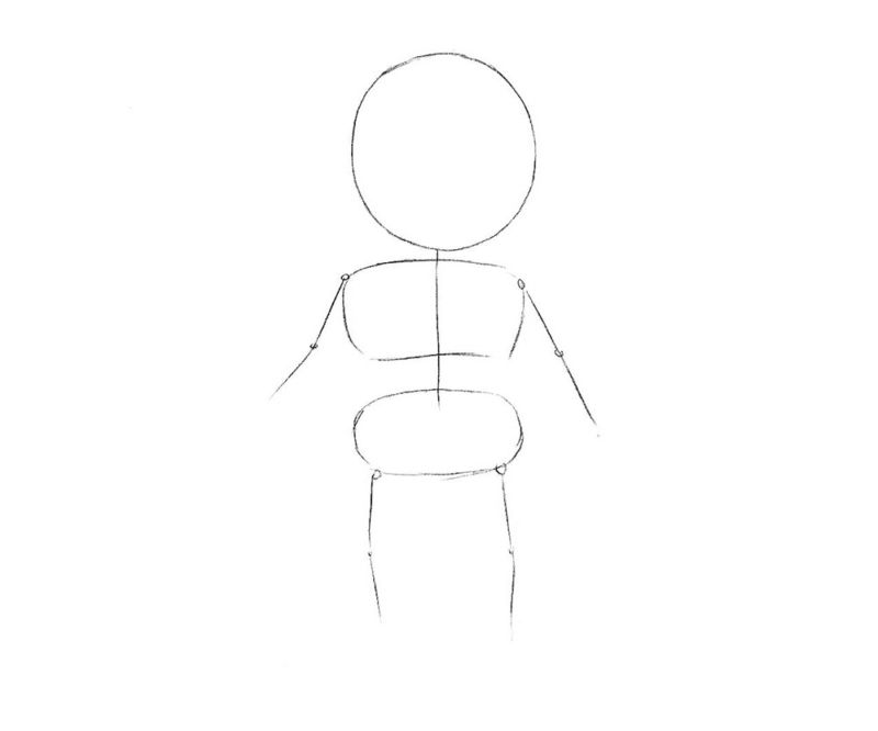 - След това нарисувайте овал. Тя трябва да е по-тясна от главата. Горната част на овала трябва леко да застъпва кръга. След това допълнителните линии трябва да бъдат премахнати, за да се постигне плавен преход.