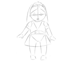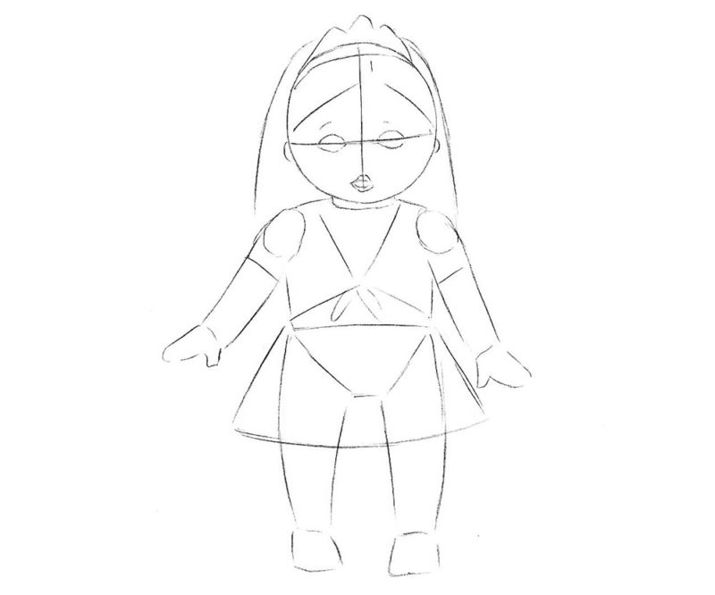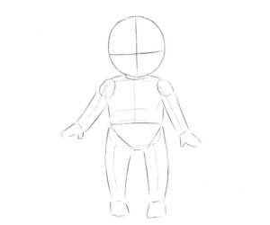 - Куклата има несъразмерни черти - главата изглежда много по-голяма от тялото. Това трябва да се вземе предвид при изобразяването на тялото, ръцете и краката. Ръцете на куклата ще се вдигнат нагоре. Вместо четки трябва временно да изобразите кръгове.