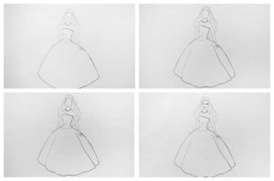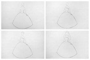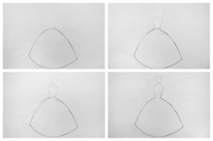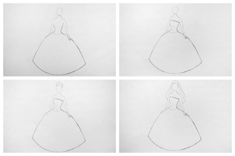 - Първо се рисува роклята. Тя трябва да изглежда луксозна и елегантна. За по-лесно представяне на роклята можете да си представите чаша, поставена с главата надолу.