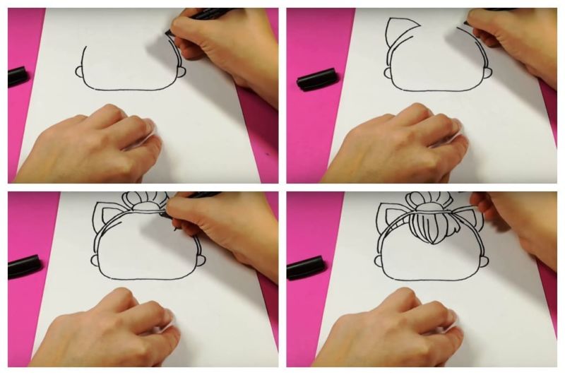 - На главата на куклата LOL може да се добави лента за глава. Тя трябва да бъде изобразена с няколко дъговидни линии и да бъде закрепена с панделка. Нарисувайте малки ушички и малки косички. Накрая добавете малки ресни - те ще са едва видими заради лентата за глава.