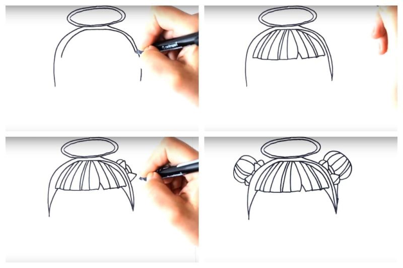 - Точно над лентата за глава нарисувайте косата на кичур.