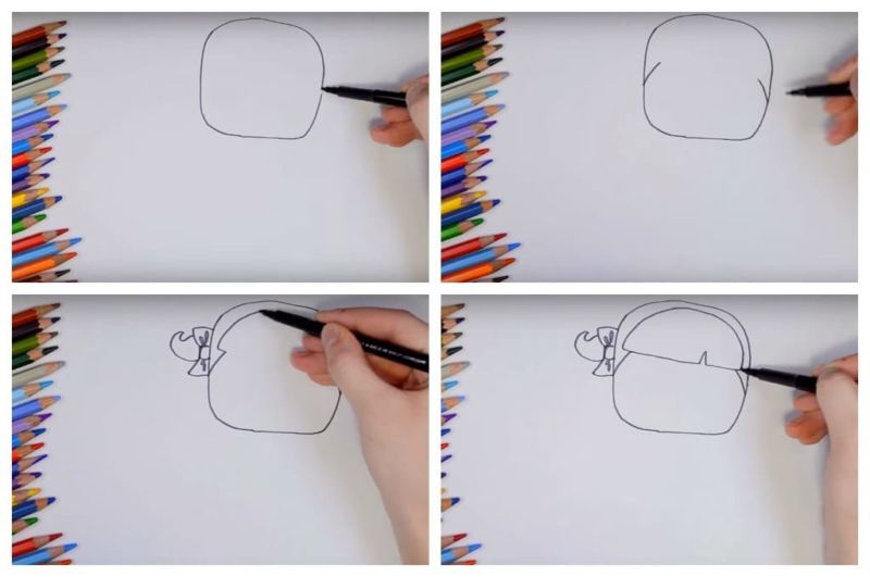 - Преминете към детайлите: на главата нарисувайте полукръг на линията на косата.