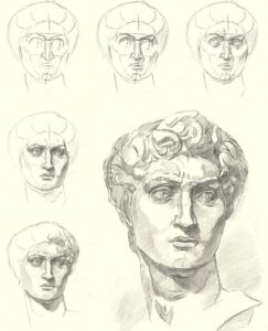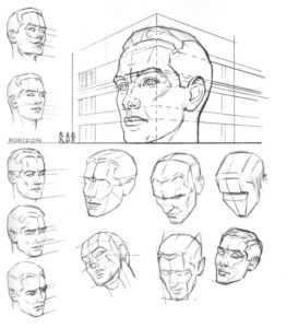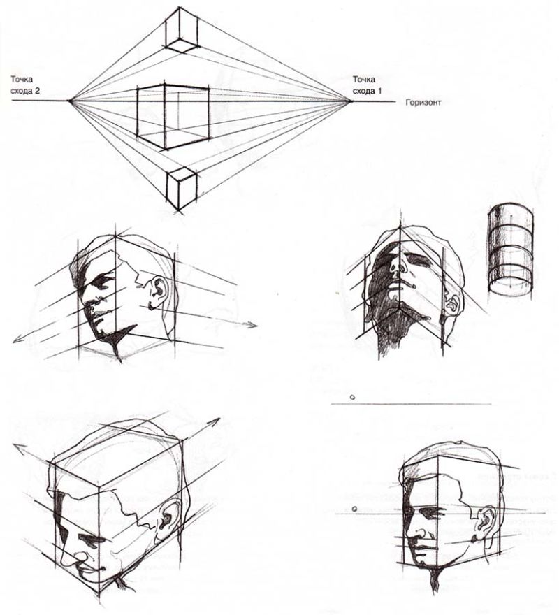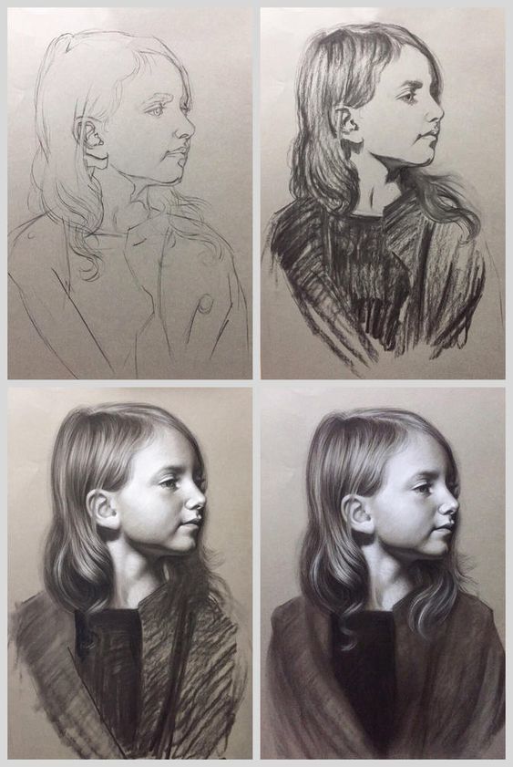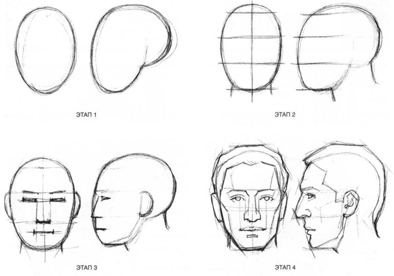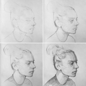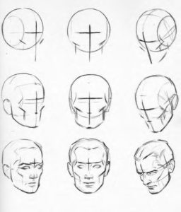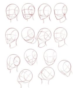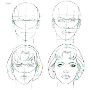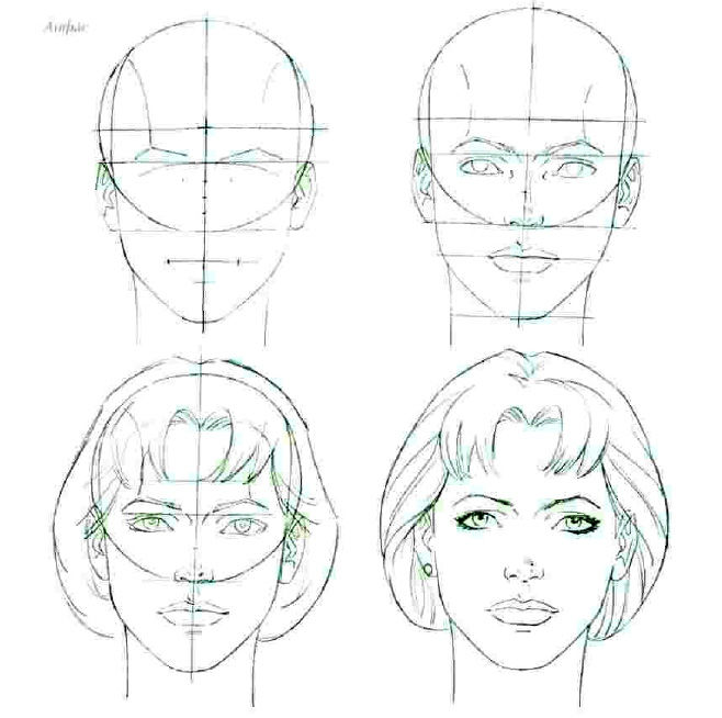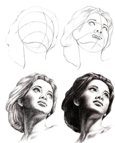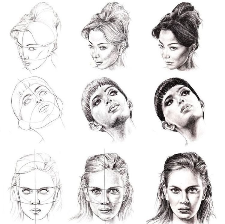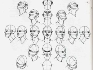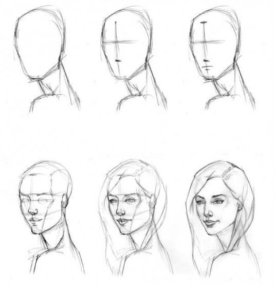- ако той е почти напълно обърнат, от видимите черти ще останат арките на веждите и скулите. Линията на шията се съединява с линията на брадичката и се намира близо до ухото. Ако изобразеното лице се обърне, миглите също се виждат;