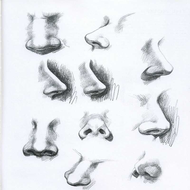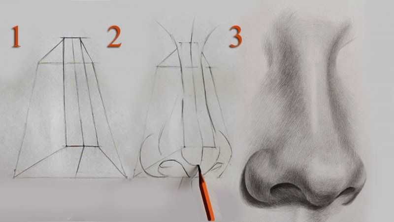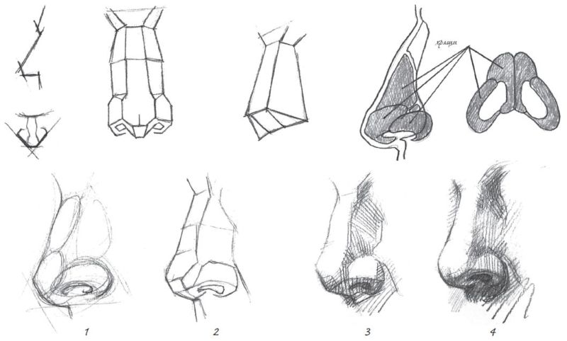 Носът трябва да се нарисува с маркер. Това помага за създаването на правилните пропорции. При създаването на сенки трябва да се използват контури с молив. По време на този процес художникът трябва да е наясно, че формата е сферична.