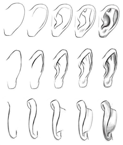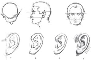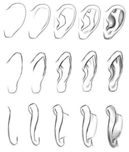 Когато рисувате ушите, имайте предвид, че горната им част често е на същото ниво като очите и че ушите трябва да се изобразяват на крайната линия на носа. Ушите са с различни размери. При някои хора те изпъкват, а при други са на едно ниво с главата.