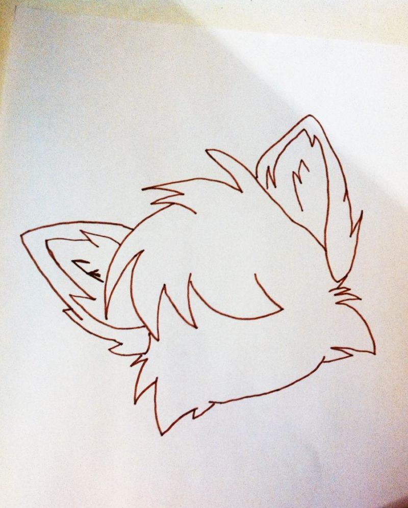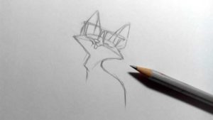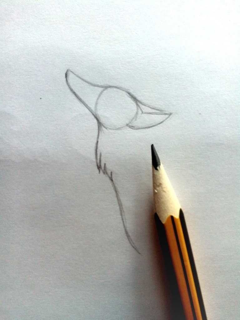 Започваме с изготвянето на скица. Поставете кръг върху хартията, за да изобразите главата на лисицата. Добавете ушите към кръга. Под главата нарисувайте овална, извита форма. Спомнете си боб с долна част, насочена надясно. Овал и кръг, свързани с две извити линии.