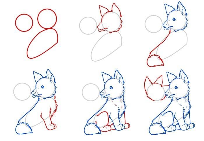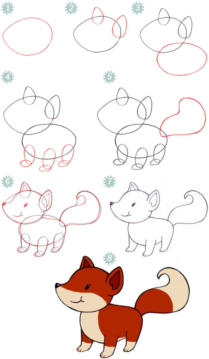 - Нарисувайте ушите му, които са настрани, от дясната страна на кръга. Носът на лисицата е в долната част, също като на майка ѝ. Начертайте две линии от върха на носа до ушите. И очите, под средата на главата. Задният крак е с формата на дъга в овала. А опашката се припокрива с лапата. Малката лисица лежи на кълбо.