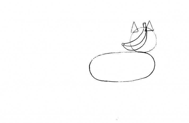 Височината на овала се разделя на три равни части. Горната част ще бъде главата, но ние ще я нарисуваме малко по-ниско. В ушите. Нарисувайте главата в кръг.