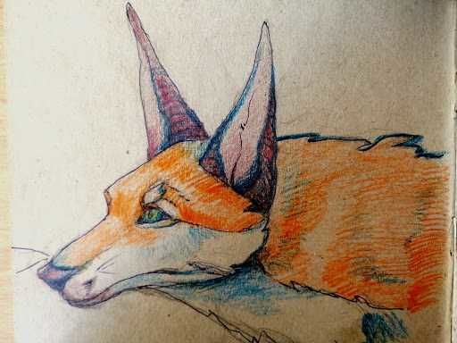 Очите на лисицата не са в средата на височината на главата ѝ, а по-високо. На същата височина е и носът. Носът е овален с малка опашка в долната част. Очите на лисицата са затворени, тя подсмърча. Очите изглеждат като две запетайки.