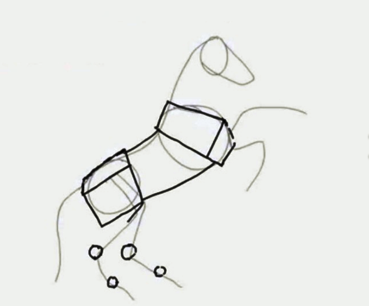 - Най-труден е образът на краката. Предните крака ще бъдат в долната част на левия овал. За улеснение нанесете базовите точки върху кривите на краката. За улеснение можем да използваме готова снимка на кон.