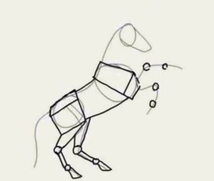 - Свържете тези точки със спомагателни линии. Необходимо е да се вземе предвид, че коленете на краката на коня са доста високи.