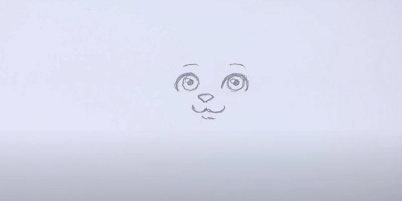 - Детайлно изобразете лицето и под формата на венчелистчета покажете очите, зениците и клепачите. Отстрани има фино засенчени мустаци. Спуснете се до шията.