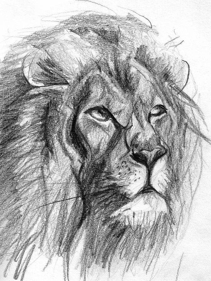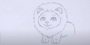 - На този етап работим върху по-острите черти на лицето на животното, то има по-мрачни вежди, мимики и грива на челото. Очертаваме по-точно ушите, гръдната част на гривата, нейния къдрав връх, бузите и острата брадичка.