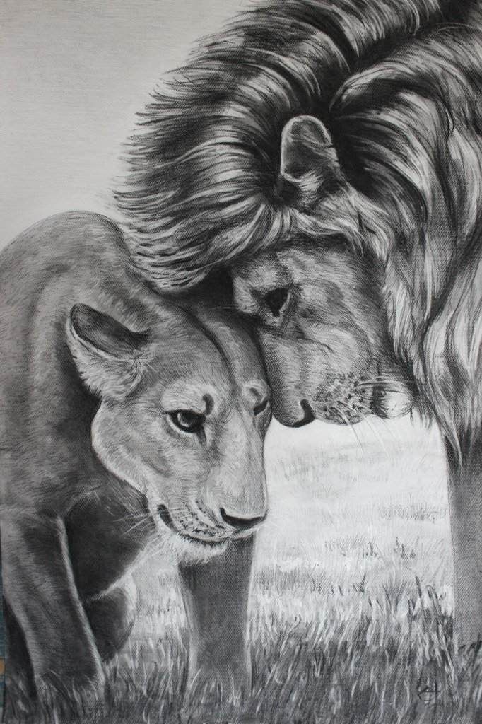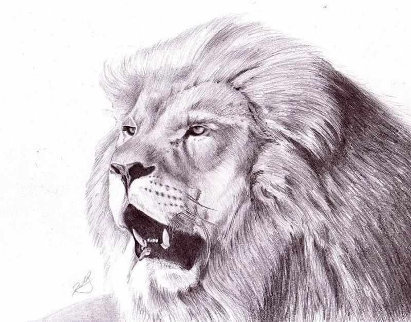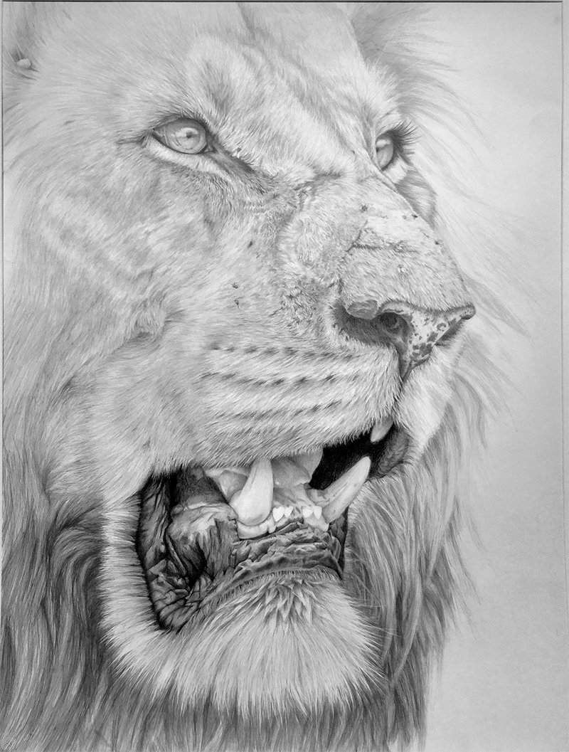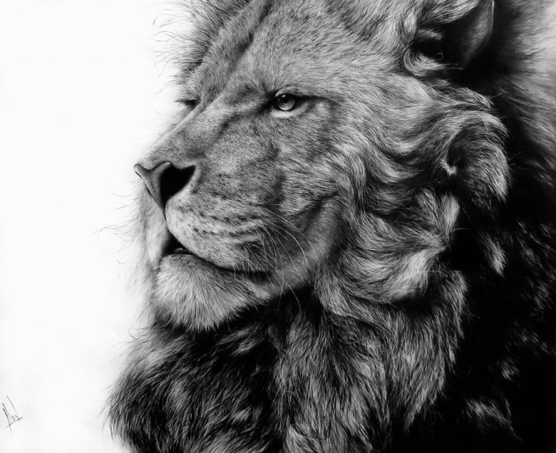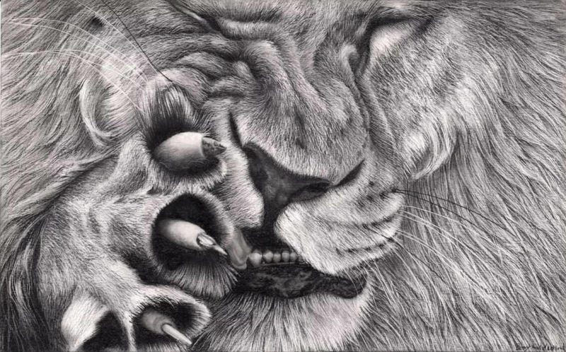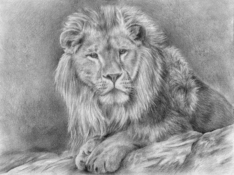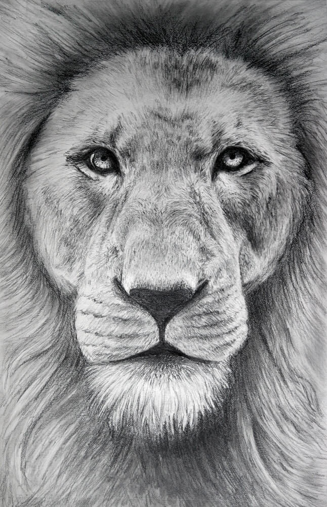 - Накрая е важно да обработите цялото изображение с къдрици, като редувате контраст и светлина. Точковите очертания на лъвските къдрици трябва да се обработят най-силно, а там, където няма достатъчно светлина, можете да изтриете леко с гумичка. С гумичката може да придадете лекота и ефирност на правилните места, а контрастът ще направи животното да изглежда обемно и реалистично.