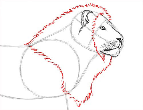 - Започваме със скициране на рисунката, като с овали се отбелязва главата, а с голям кръг - гривата. След това нарисувайте предна лапа с овал, а после оформете огънат заден крак. Маркирайте задната част на торса с кръг и извит силует на опашката върху него.