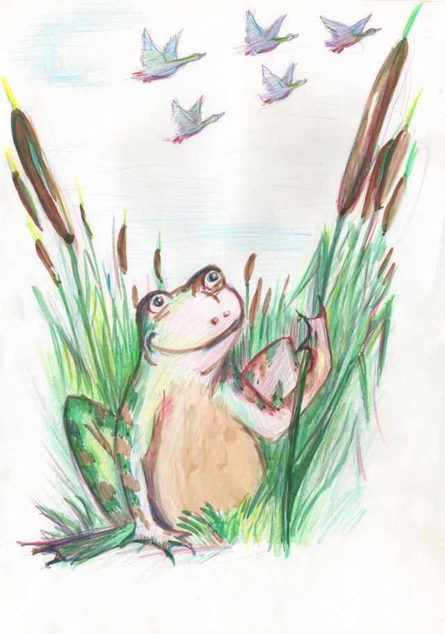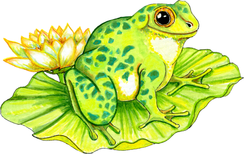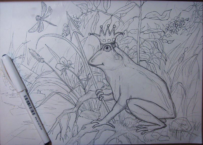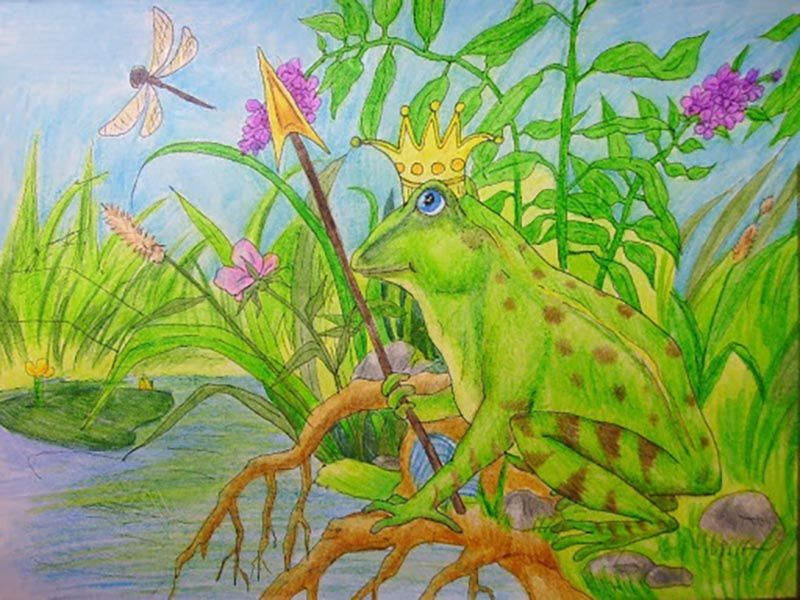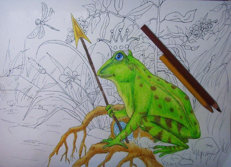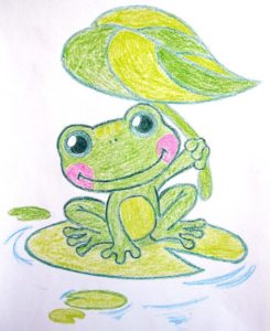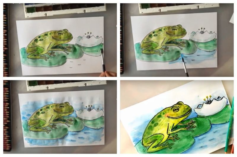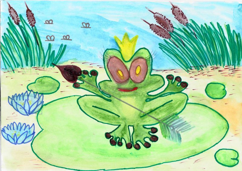 Добавяме точки на челото с обикновен молив. С жълт молив са нарисувани короната, стрелката, коремчето, а със син - очите. Зеленият цвят се използва за всички останали части на тялото. Довършваме рисунката на водна лилия в долната част и я боядисваме в зелено. Нека си представим водни вълни и няколко растения.
