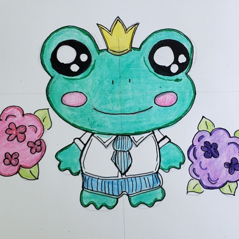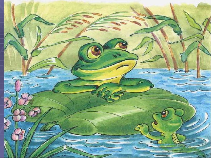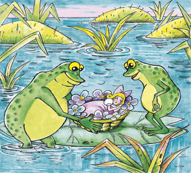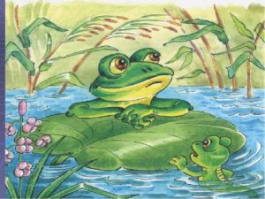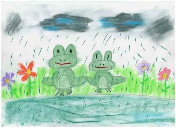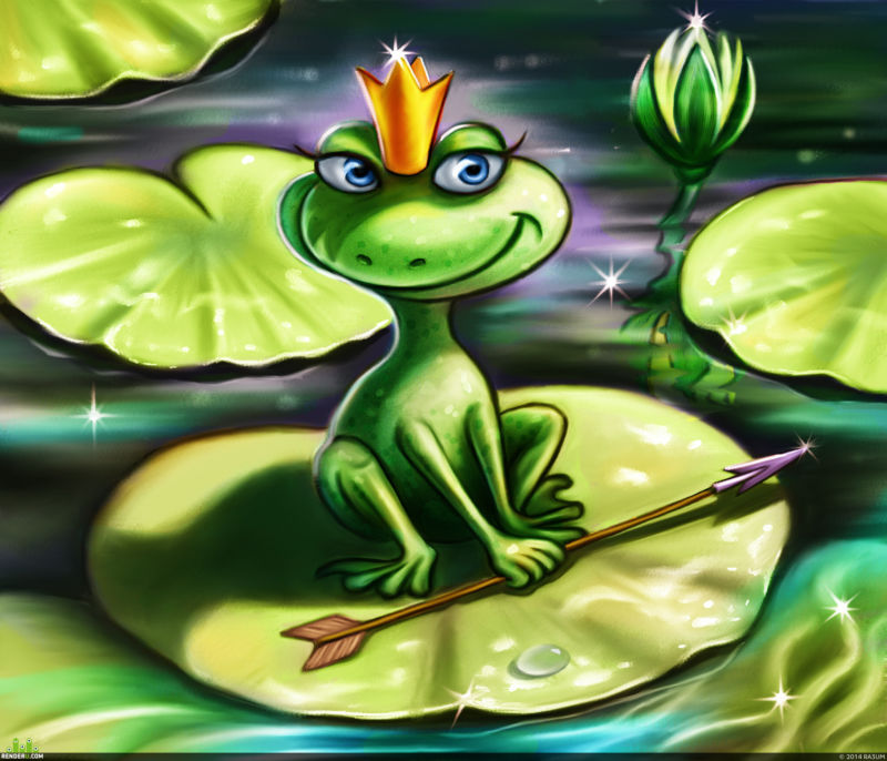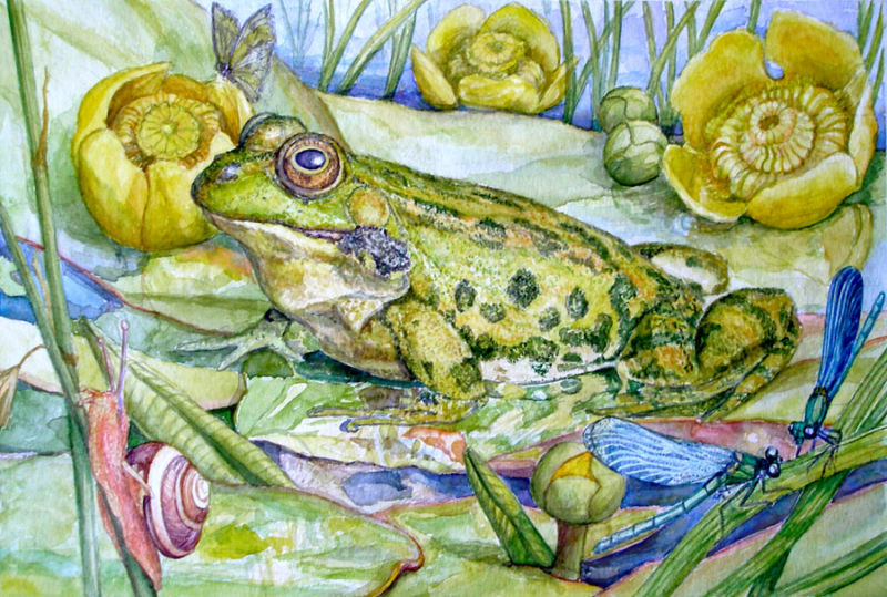 Добавяме точки на челото с обикновен молив. С жълт молив са нарисувани короната, стрелката, коремчето, а със син - очите. Зеленият цвят се използва за всички останали части на тялото. Довършваме рисунката на водна лилия в долната част и я боядисваме в зелено. Нека си представим водни вълни и няколко растения.