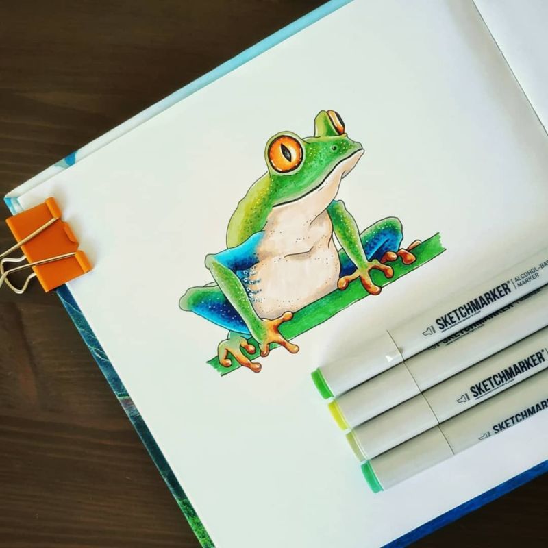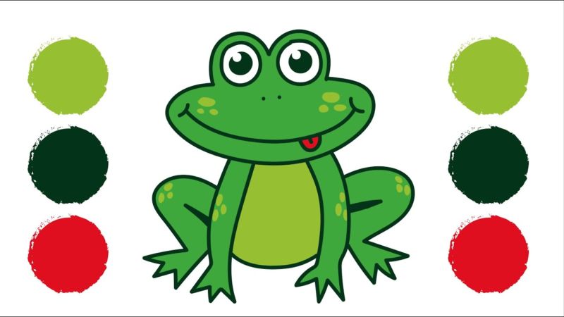 Изтрийте ненужните линии с гума. Нарисувайте около жабата с черен маркер и преминете към оцветяването ѝ. С тъмнозелен молив нарисувайте малки кръгове на краката отгоре, на главата между очите и на бузите.
