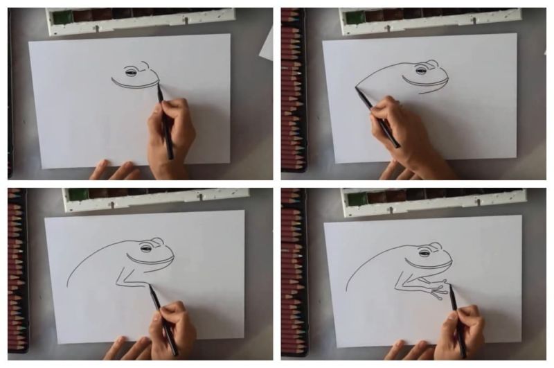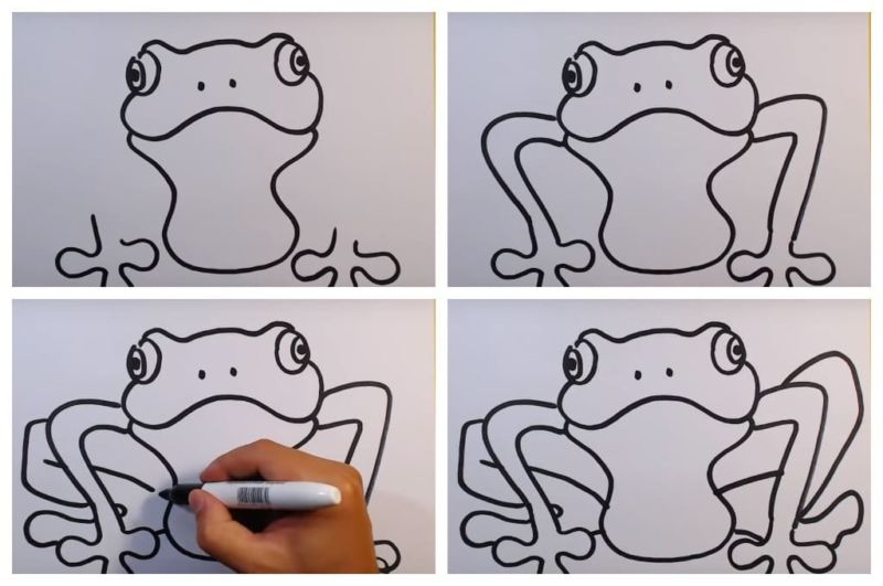 Това е права линия, като "самолетът" е отгоре, а "къщата" - отдолу. От дясната страна ръката се опира на коляното на жабата. Не забравяйте да очертаете линията на корема. Под тях се очертават големи крака, дори и плавниците.