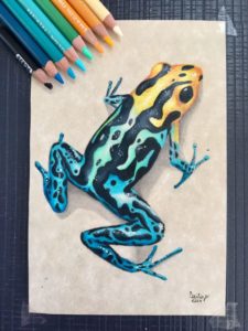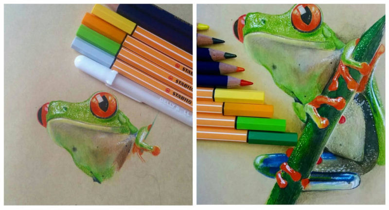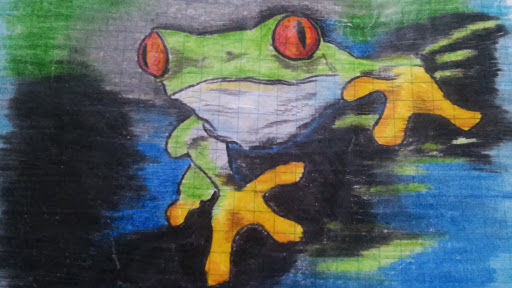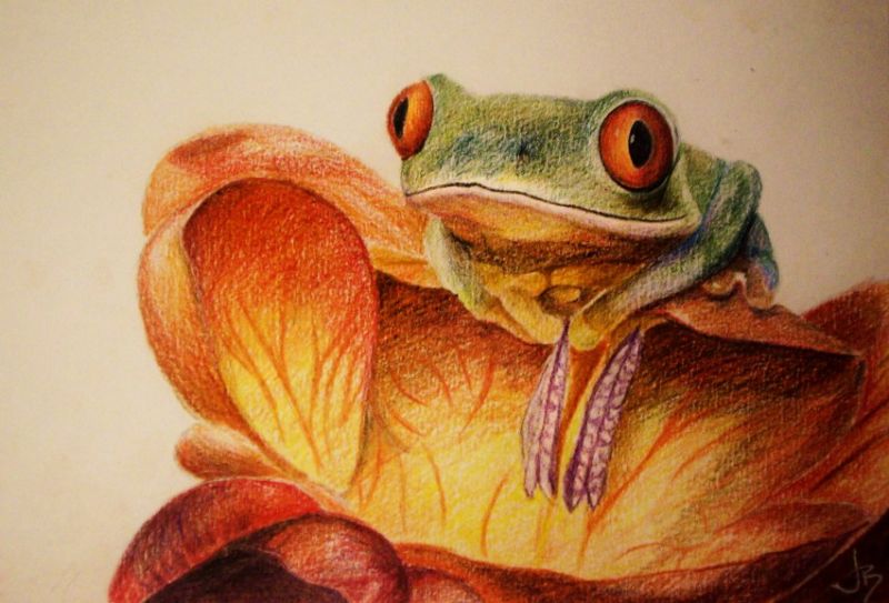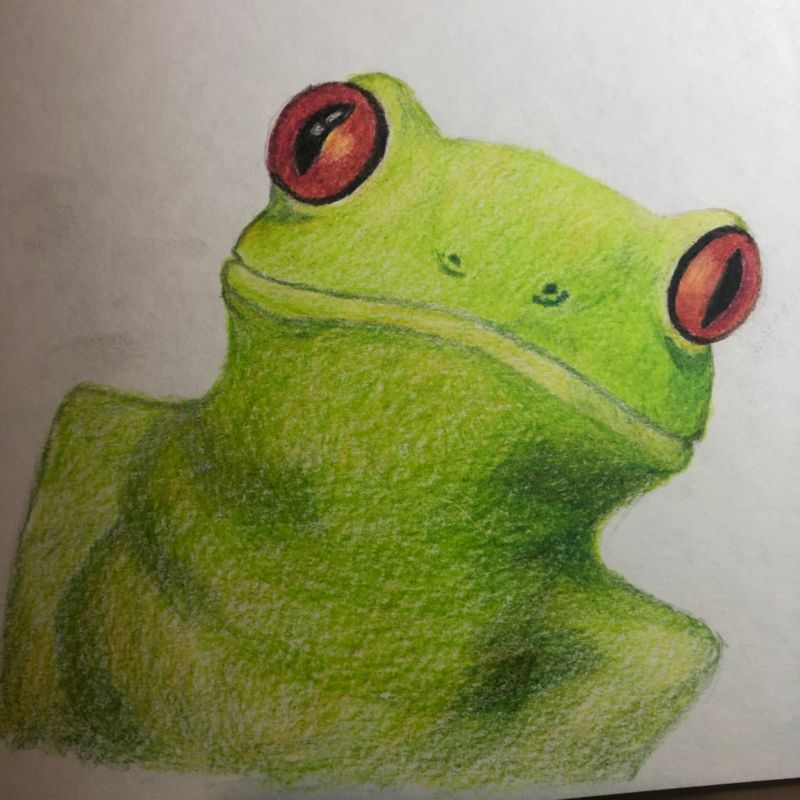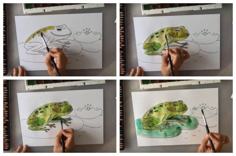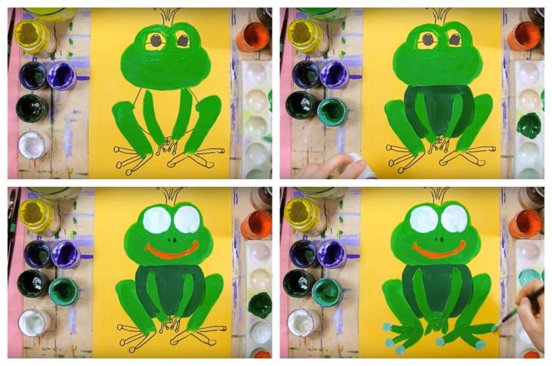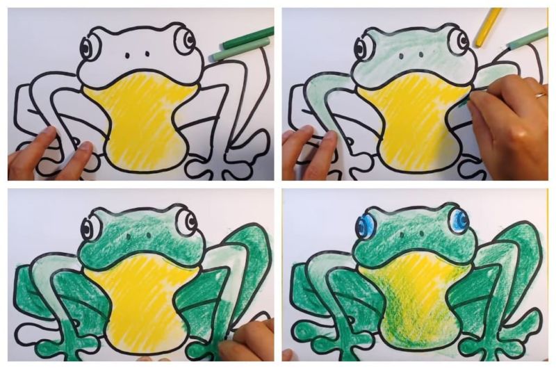 Зелено за очите от лявата страна и синьо за дясната. С жълт пастел се рисува горната част на главата на жабата. Оцветете цялата глава в светложълто. Нарисувайте сянка върху главата от лявата страна и около врата с тъмнозелено.