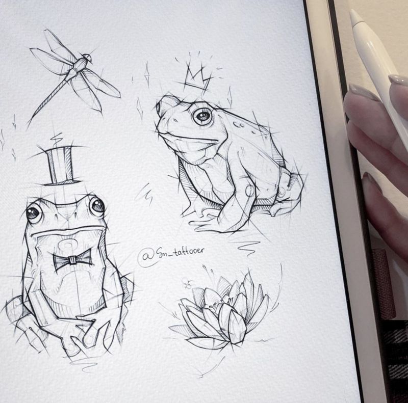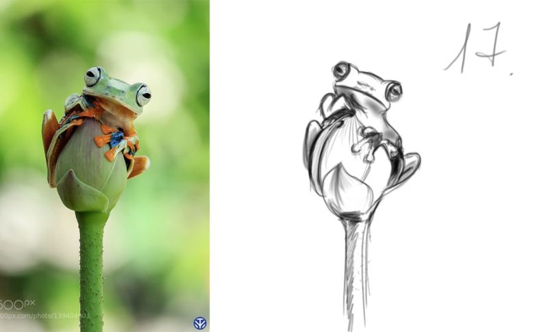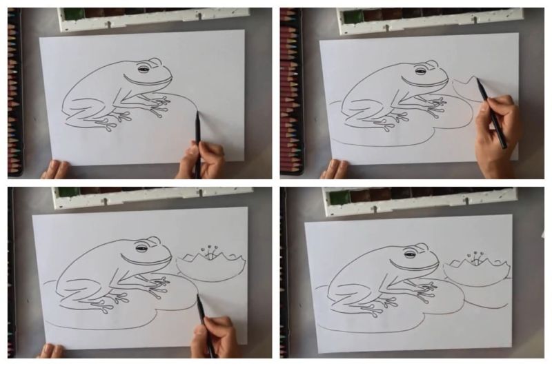 Задните крака нарисувайте в кръг, след това добавете лапа в долната част и готово. Жаба, седнала върху лилия, нарисувайте я под жабата. Водната лилия има сърцевидна форма, само че върхът ѝ не е заострен.