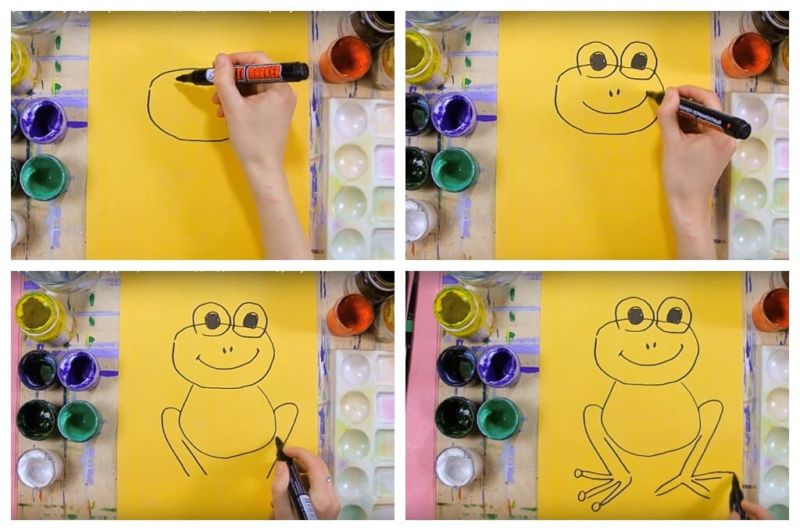 Всички зелени флумастери: Първо нарисувайте главата на жабата - сплескан овал точно над средата на листа. Листът е в хоризонтално положение. Поставете очите като два кръга върху него. Добавете устата. Сега нарисувайте торса. Двете линии започват от главата.
