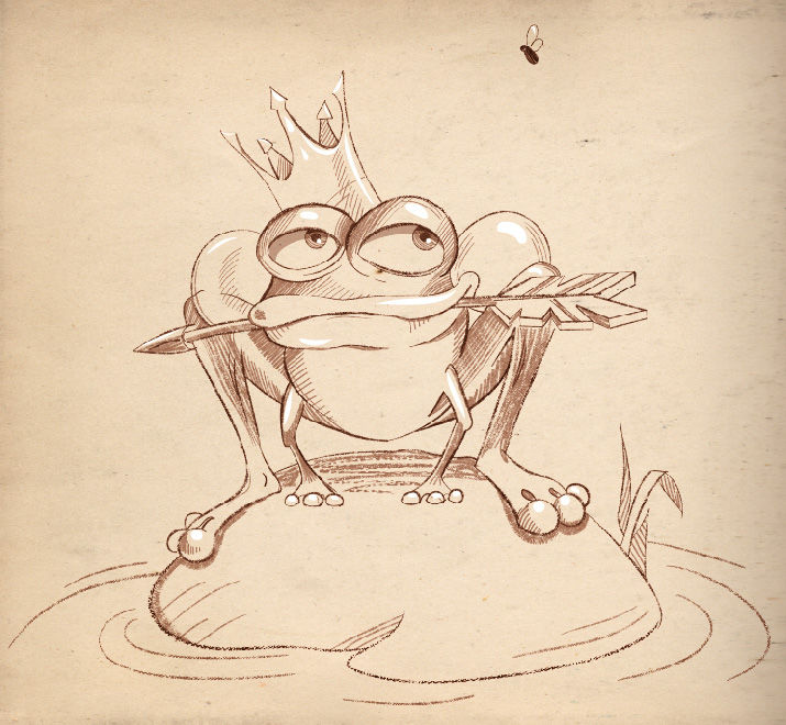 От върховете на очите водят линиите на бузите, но те не се затварят помежду си. На главата от лявата страна на рисунката има корона. От линията на лявата буза минава полукръг, който преминава в ръката и пръстите. Жабата ги държи близо до себе си, близо до устата. В самата си ръка държи стрела.
