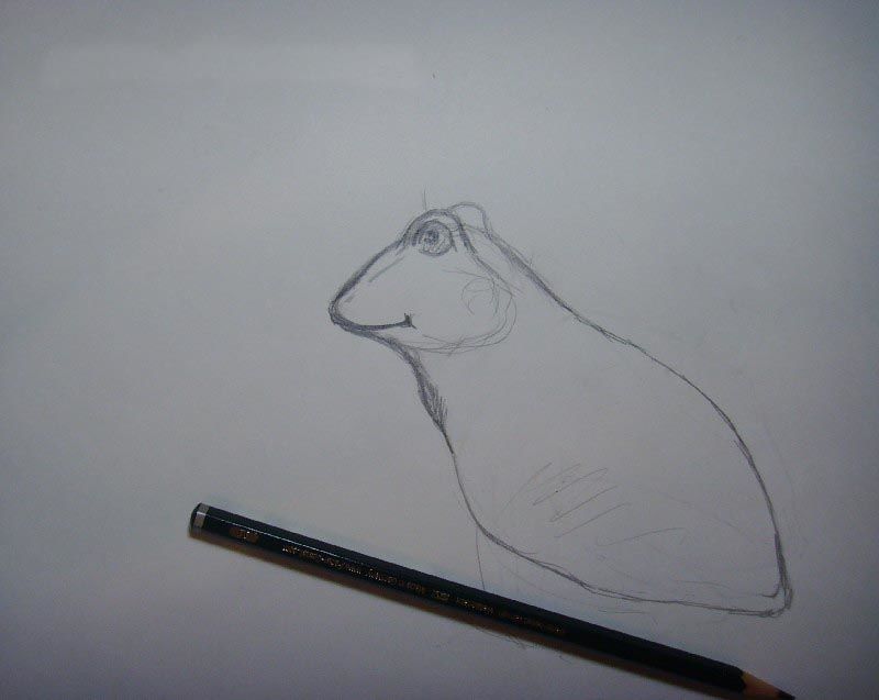 След това начертайте кръгова линия, след това малко полуовалче и оттам идва малко стъпало отдолу, което представлява три малки овалчета. Рисувате и предния крак. От лявата страна начертайте линия от окото и покажете бузата и корема.
