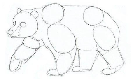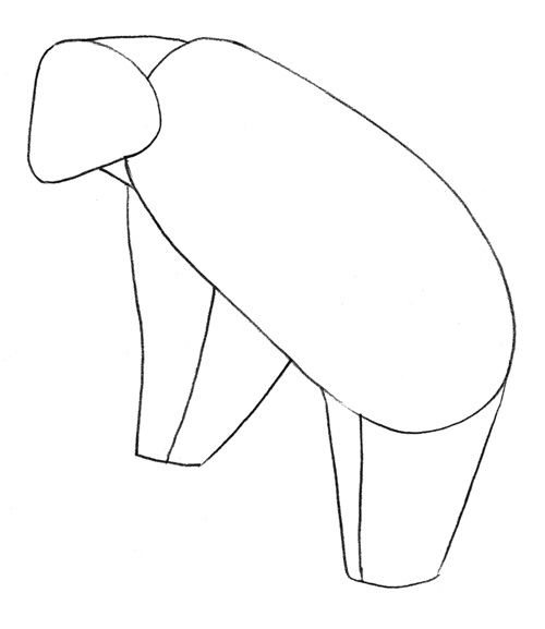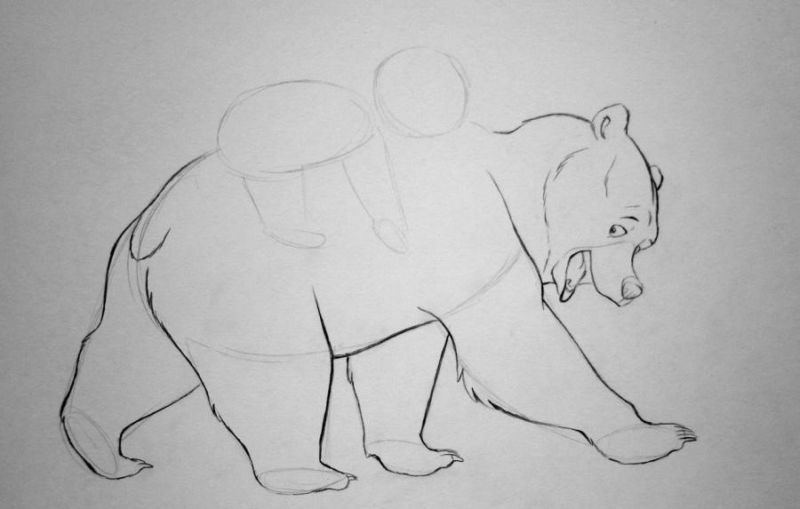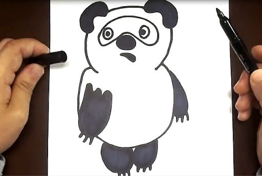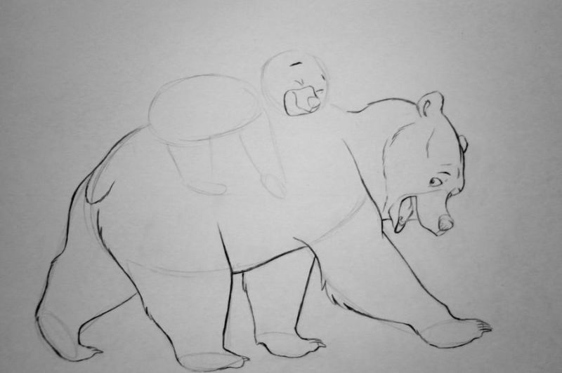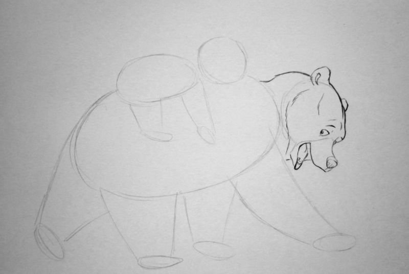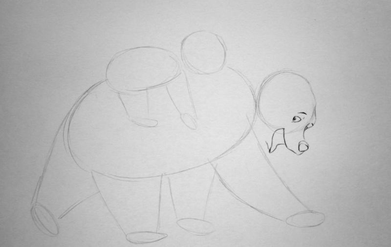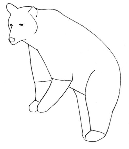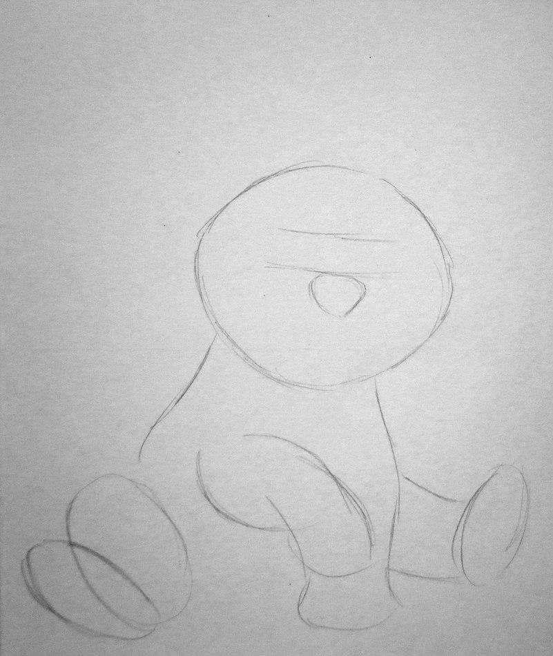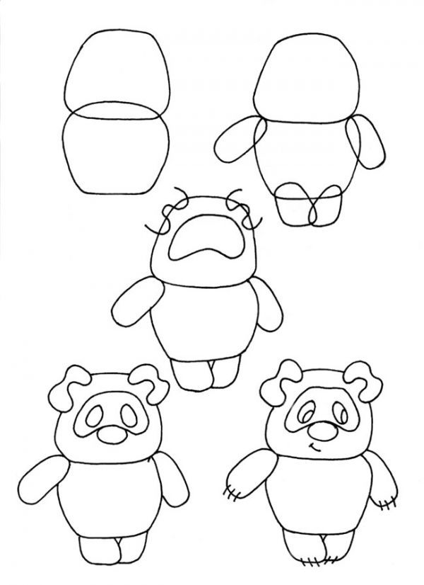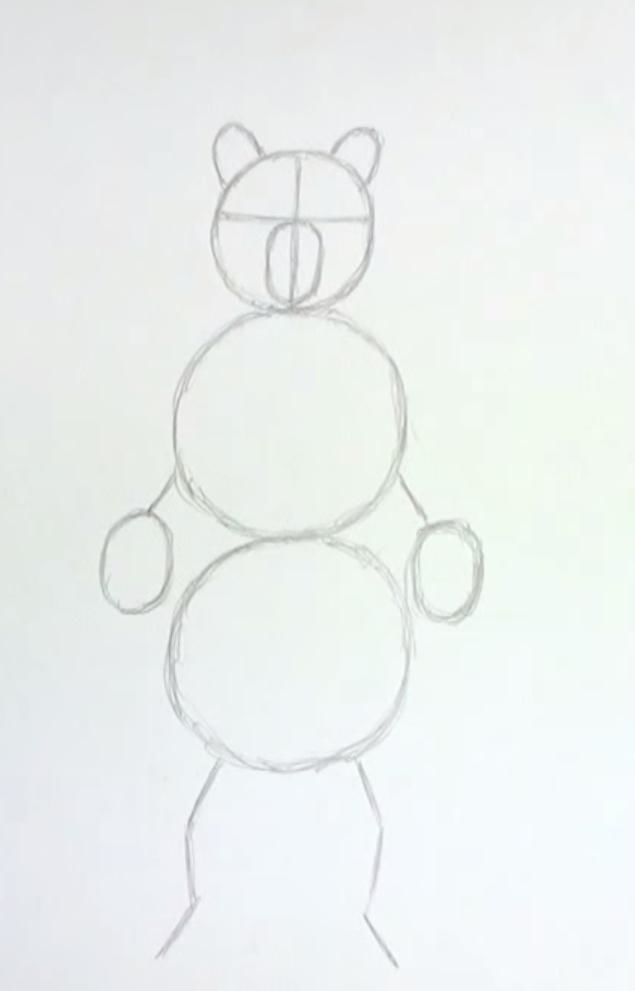 Като започнете от главата, първо надолу и наляво, рисувайте така, сякаш рисувате ръкав на къса риза. Без да сваляте ръцете си от хартията, нарисувайте лапа отдолу. Начертайте вертикална линия, но не голяма. Нарисувайте долната част на десния крак и десния "ръкав". Вътре в торса нарисувайте кръг (корем), чийто връх докосва главата.