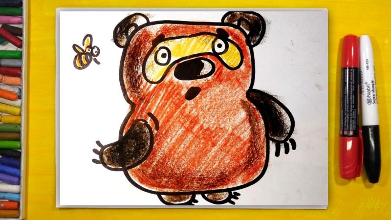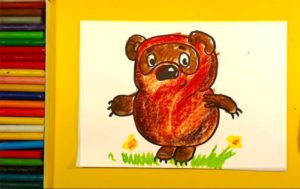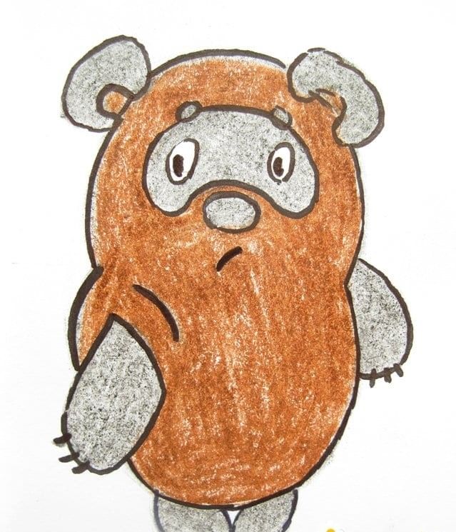 Нарисувайте с кафява боя тялото на Мечо Пух. Не докосвайте лапите, ушите и маската. Нарисувайте лапите, ушите и маската с по-тъмно кафяво. Вземете черен пастел и нарисувайте сенки върху торса, краката и главата. Можете да нарисувате зелена трева и цветя.